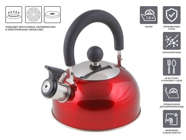 Чайник со свистком, нержавеющая сталь, 1.5 л, серия Holiday, красный металлик, PERFECTO LINEA