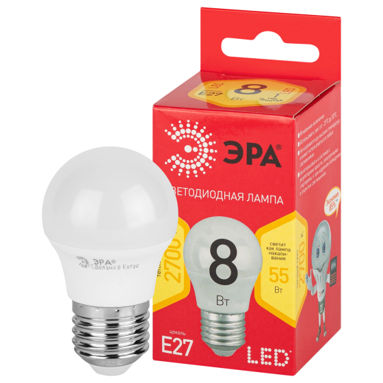 LED P45-8W-827-E27 R Лампочка светодиодная ЭРА RED LINE LED P45-8W-827-E27 R E27 / 8Вт шар теплый белый свет
