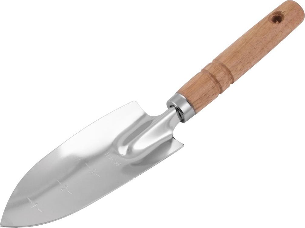 Совок садовый ЦЕНТРОИНСТРУМЕНТ (0532-2) с узким лезвием. Шкала для удобства в работе. Нержавеющее покрытие. Ручка из натурального дерева, покрытая лаком.