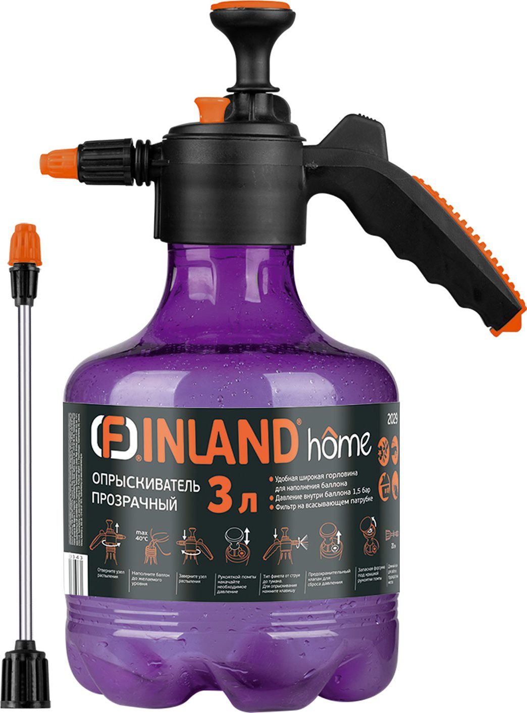Опрыскиватель ручной 3 л FINLAND Home 2029 – это дмашний опрыскиватель с прозрачным баллоном для ухода за комнатными, садовыми и огородными растениями, для подкормки, полива и химической защиты от вредителей и болезней растений, для обработки и чистки поверхностей, стен и стекол. Удобная широкая горловина для наполнения баллона. Угол распыления регулируется вращением форсунки. Тип факела от струи до тумана. Предохранительный клапан для моментального сброса давления внутри баллона. Эргономичная форма рукоятки. Фильтр на всасывающем патрубке. Запасная форсунка под крышкой рукоятки помпы. Длинный носик с форсункой для работы в труднодоступных местах.