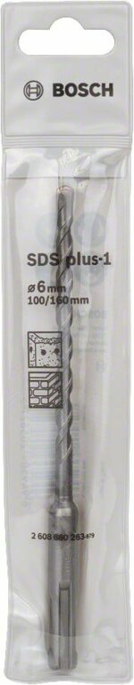 Бур (сверло) SDS-plus 6х100х160 мм BOSCH SDS-plus 1 (2608680263) служит для изготовления отверстий в неармированном бетоне, кирпичной и блочной кладке диаметром 6 мм и на глубину до 100 мм. Твердосплавная пластина с центрирующим элементом для большей точности отверстий.
