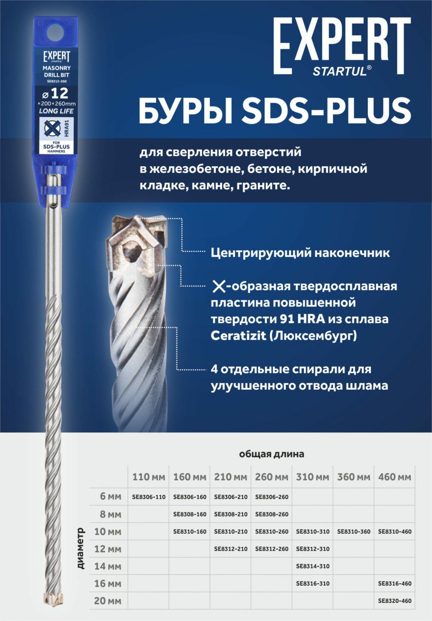 Бур (сверло) SDS-plus 6х50х110 мм STARTUL Expert (SE8306-110) используется для особо сложных работ при сверлении отверстий в железобетоне, бетоне, кирпичной кладке, камне, граните. Оснащен цельным X-образным твердосплавным наконечником Ceratizit повышенной твердости с четырьмя режущими кромками, который фиксируется особо прочным припоем, рассчитанным на высокие рабочие температуры и значительные ударные нагрузки. Центрирующий наконечник обеспечивает точное засверливание. 4 отдельные канавки быстро и эффективно удаляют шлам и повышают производительность. Тело сверла обладает большей жесткостью, а следовательно меньше подвержено колебаниям в процессе бурения, что улучшает точность просверленного отверстия, снижает износ тела бура и вибрации перфоратора. Подходит для интенсивных нагрузок.