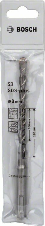 Бур (сверло) SDS-plus 8х100х160 мм BOSCH SDS-plus 1 (2608680270) служит для изготовления отверстий в неармированном бетоне, кирпичной и блочной кладке диаметром 8 мм и на глубину до 100 мм. Твердосплавная пластина с центрирующим элементом для большей точности отверстий.