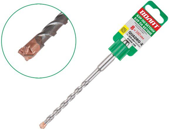 Бур (сверло) SDS-plus 8х100х160 мм ВОЛАТ Quadro-x (83008-160) служит для сверления отверстий в бетоне, кирпичной кладке, камне, граните. Двойной крестообразный наконечник облегчает процесс сверления и образует более ровное (правильной формы) отверстие в обрабатываемом материале. Бур используется в перфораторах с типом крепления SDS-plus. Тип пластины: крестовая. Материал пластины: твердосплавная с победитовым наконечником YG8C. Марка стали: легированная сталь 40Х. Упаковка: индивидуальный подвес с отверстием под крюк.