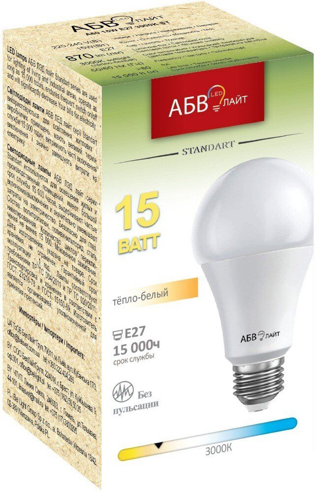 Лампа светодиодная E27 АБВ Лайт Standart A60 15W 3000К используется для освещения жилых и производственных помещений.