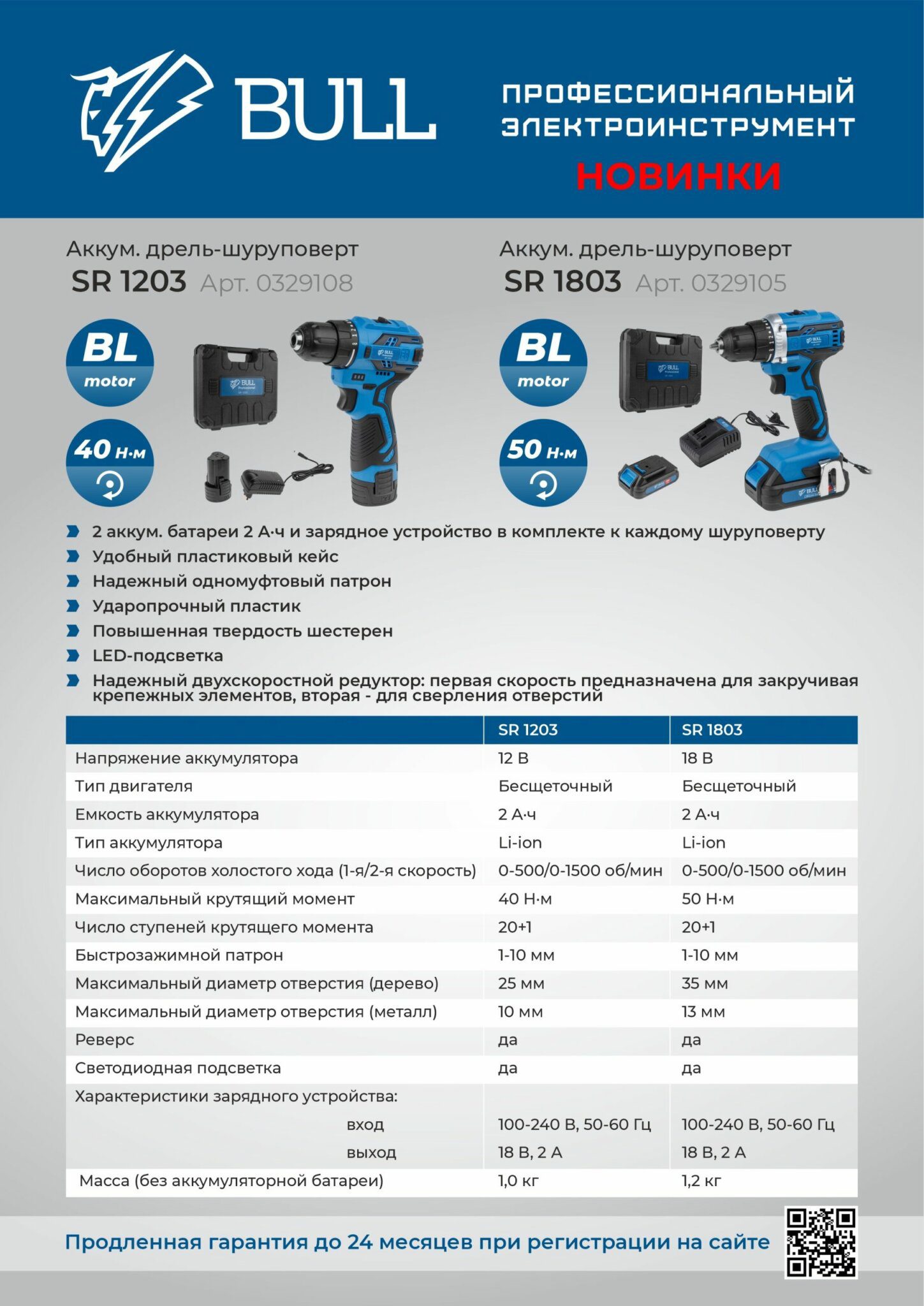 Дрель-шуруповерт аккумуляторная BULL SR 1803 (0329105) оснащена бесщеточным двигателем, который способствует повышенной устойчивости дрели к нагрузкам, простоте в обслуживании инструмента. Модель оснащена мощным двигателем с высоким крутящим моментом до 50 Н·м, имеет быстрозажимной патрон 10 мм. Для удобства работы предусмотрена подсветка рабочей зоны, индикатор уровня заряда. Аккумуляторная дрель-шуруповерт оснащена двухскоростным редуктором: первая скорость предназначена для закручивая крепежных элементов, вторая – для сверления отверстий. Благодаря регулировке крутящего момента инструмент можно использовать при работе c различными материалами. Эргономичная рукоятка имеет мягкую накладку для более комфортной и безопасной работы. Два аккумулятора ёмкостью 2 А/ч и зарядное устройство, входящие в состав комплекта поставки, обеспечивают непрерывную работу инструмента.