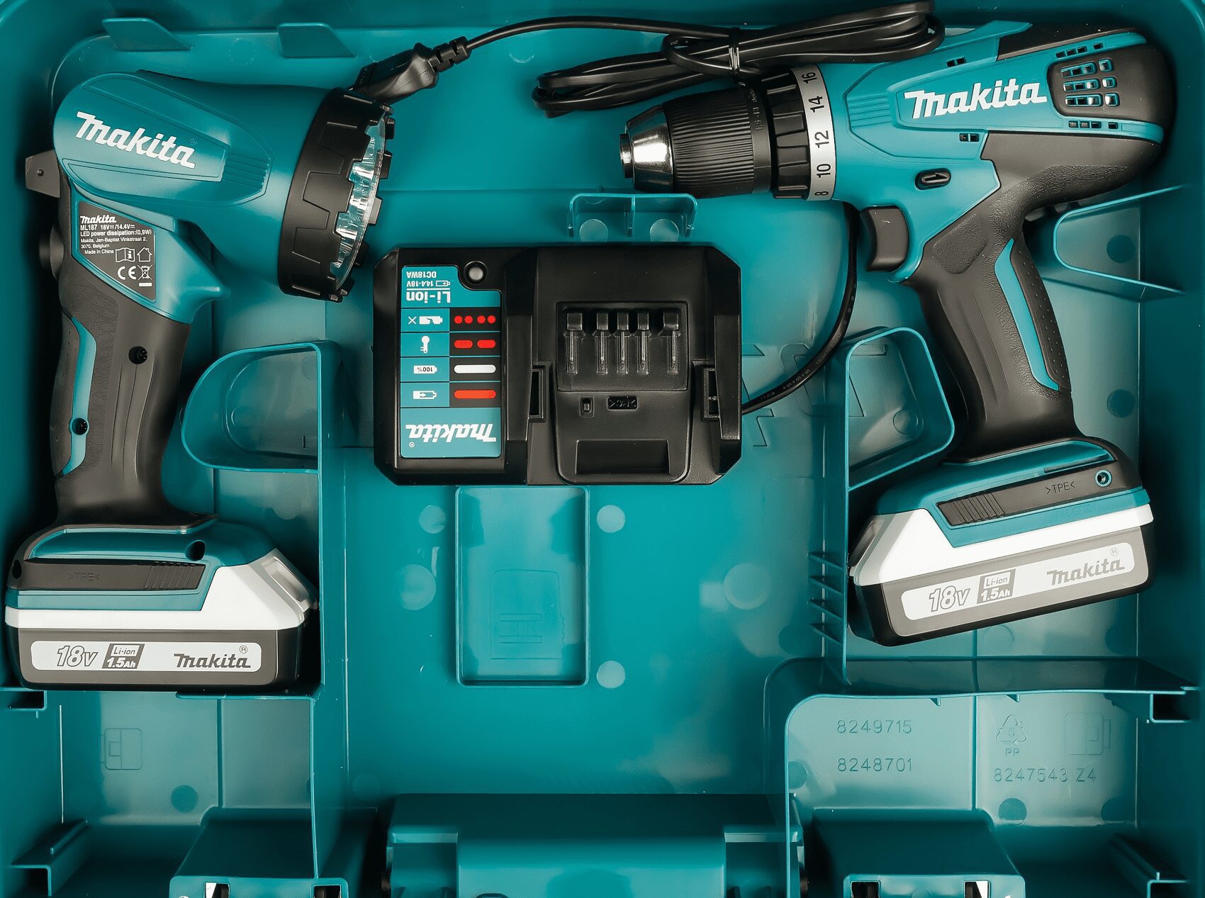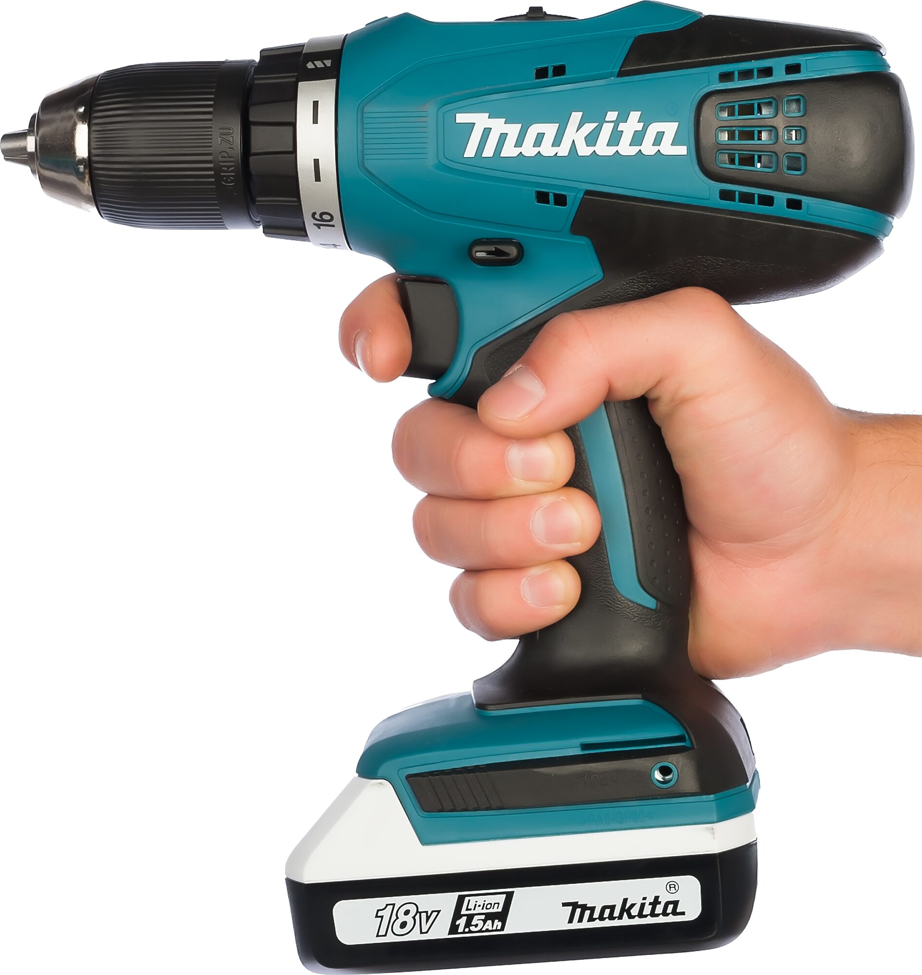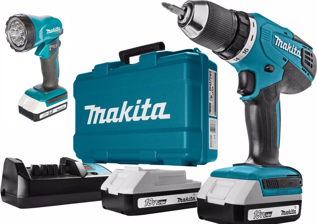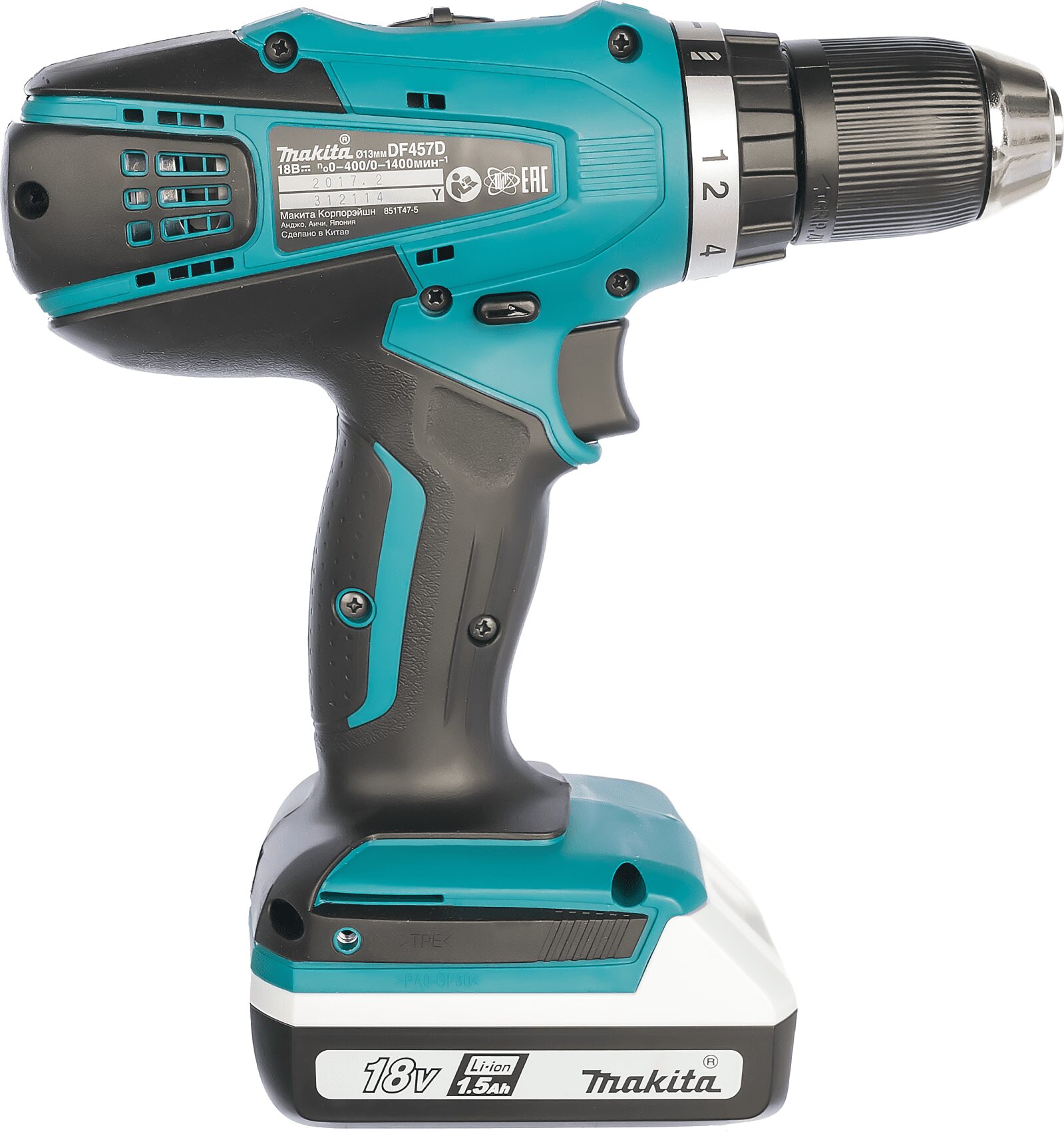 Дрель-шуруповерт аккумуляторная MAKITA DF 457 DWLE и фонарь (DF457DWLE) – шуруповерт высокого класса для различных видов работ строительно-ремонтного, монтажного и другого назначения. Имеет удобную эргономичную рукоятку обеспечивающую комфорт и удобство при длительной работе с инструментом, а также усиленную защиту от проникновения пыли и влаги. Быстрозажимной патрон обеспечивает легкую смену биты одной рукой. Электронная регулировка количества оборотов позволяет повысить точность работы. Отдельный переключатель режимов на корпусе. Батарея – тип G.