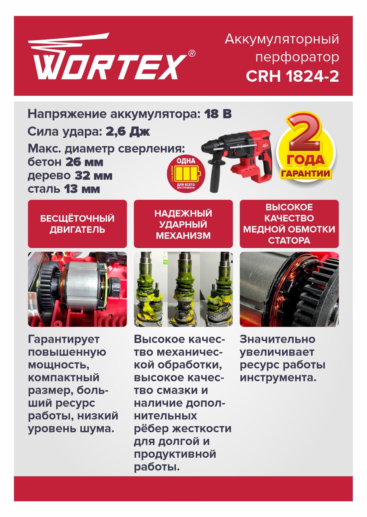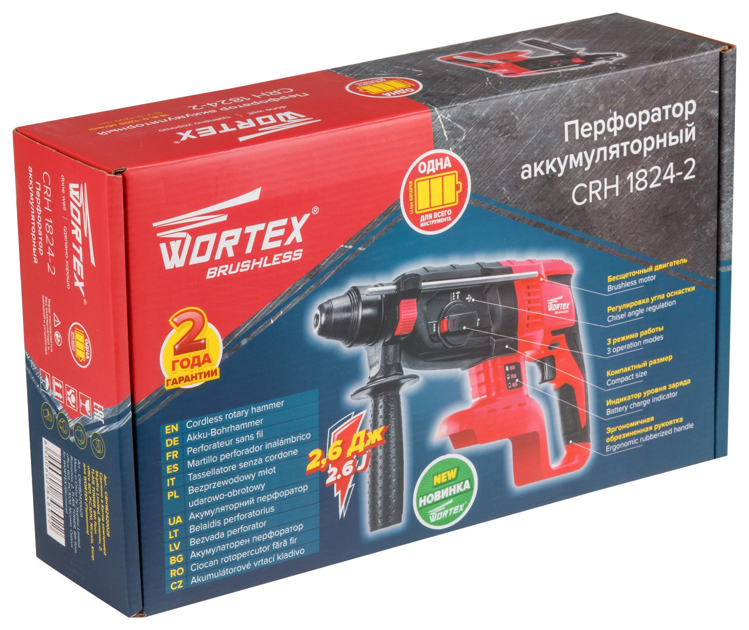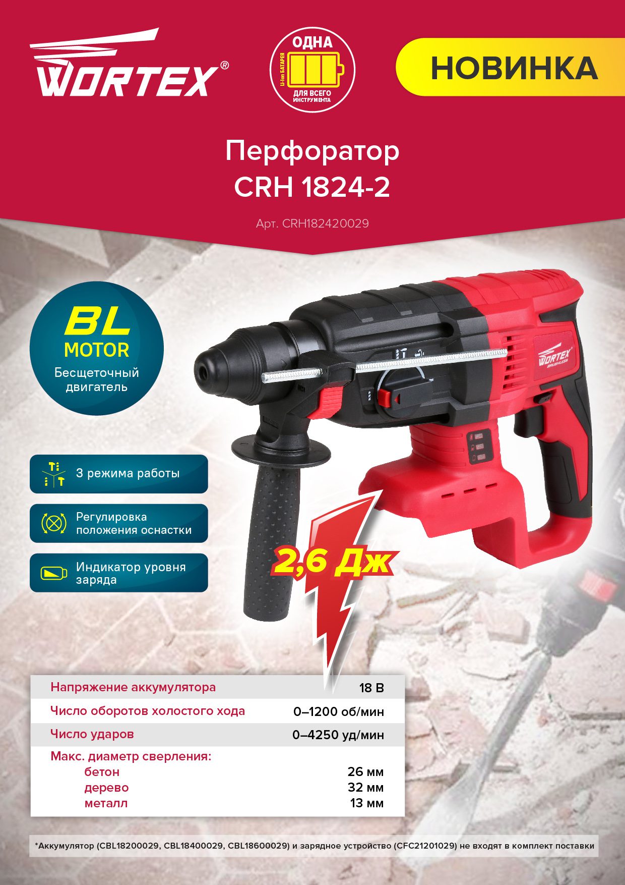 Перфоратор аккумуляторный WORTEX CRH 1824-2 ALL1 (CRH182420029) модель имеет бесщеточный двигатель, что способствует повышенной устойчивости к нагрузкам, обеспечивает легкость инструмента, простоту в его обслуживании. Малый вес и компактные размеры делают данный перфоратор незаменимым при работе в труднодоступных местах. Имеет три режима работы: сверление, сверление с ударом, долбление, а также функцию регулировки угла оснастки. Индикатор уровня заряда помогает вовремя заменить батарею.