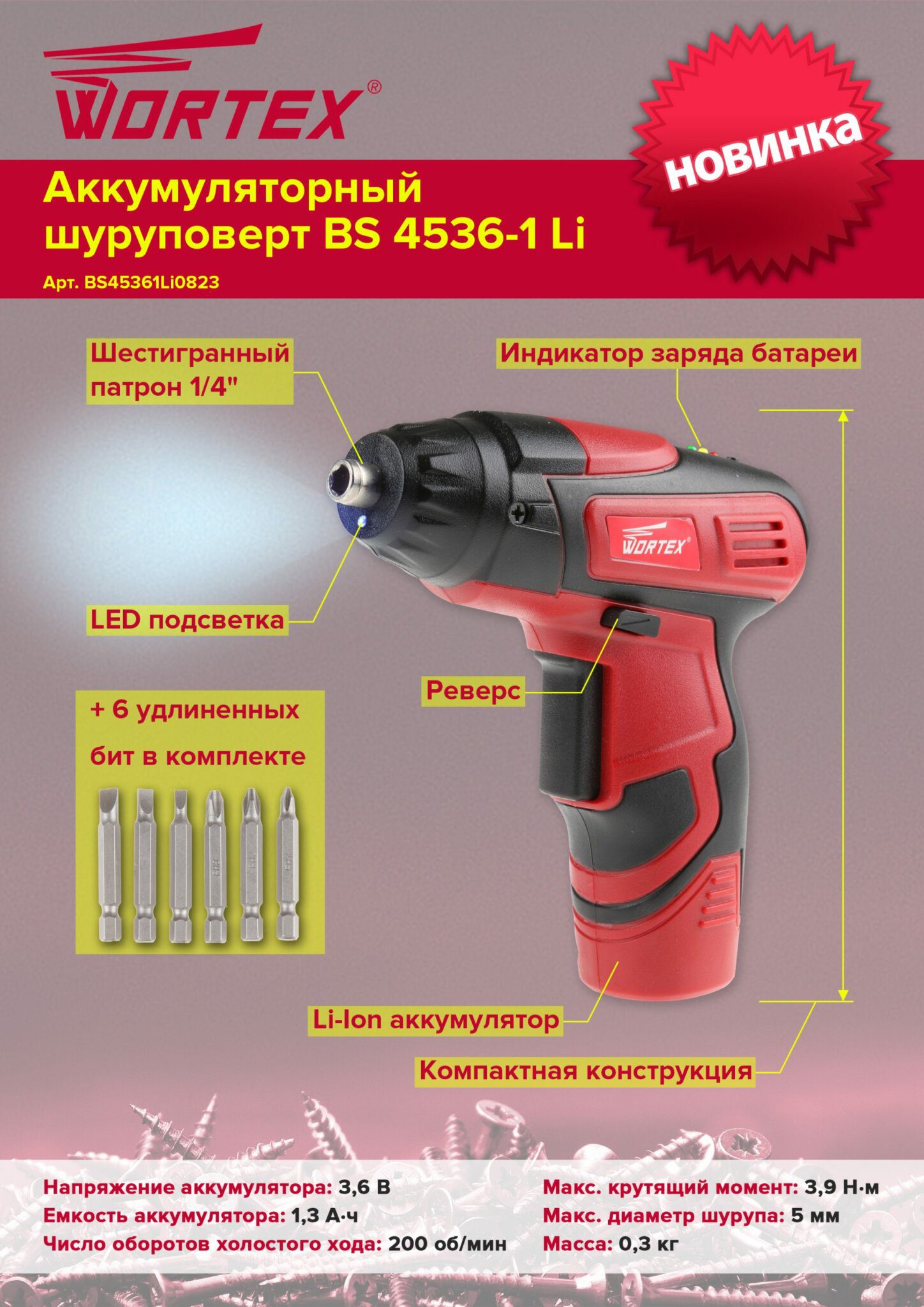 Отвертка аккумуляторная WORTEX BS 4536-1 LI (BS45361LI0823) компактный и легкий, но в тоже время мощный, предназначен для завинчивания шурупов в различные материалы. В шуруповерте используется Li-Ion технология, срок службы таких аккумуляторов значительно превышает Ni-cd. Низкий уровень саморазрядки. Для удобства слежения за разрядом аккумулятора, предусмотрены световые индикаторы, присутствует функция реверса.