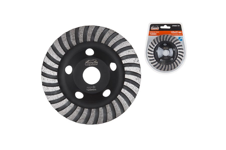Чашка алмазная шлифовальная 125х22,2 мм Turbo GEPARD (GP0806-125) применяется для финишного шлифования бетонных, гранитных, мраморных, кирпичных, каменных и других особо твердых поверхностей, поскольку на фрезах используется мелкофракционная алмазная крошка. Предназначена для снятия тонкого слоя материала при выполнении точных работ, повторяющих все изгибы поверхности. Поверхность после обработки становится идеально ровной. Изделие является сменной составной частью углошлифовальных или мозаично-шлифовальных машин, имеющих посадку 22,2 миллиметра. Высокий ресурс использования.