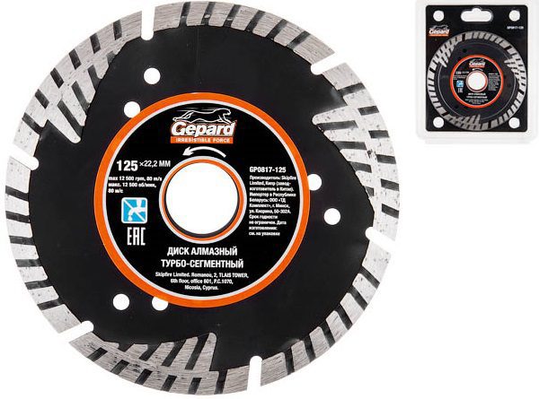 Круг алмазный 125х22 мм турбо-сегментный GEPARD (GP0817-125) для сухой резки армированного бетона, железобетона, кирпича, природного камня, мрамора, гранита и других твердых материалов. Высокая скорость реза. Защитные сектора обеспечивают защиту режущего слоя от бокового износа. Турбированная форма обеспечивает плавный безударный рез. Продолжительный ресурс работы обеспечивается высокой концентрацией алмазов, улучшенным качеством алмазных зерен и оптимально подобранной металлической связкой. Оборотов в минуту (RPM): 12500. Максимальная окружная скорость, м/с: 80.