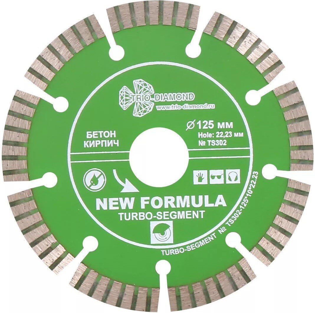 Круг алмазный 125х22,23 мм TRIO-DIAMOND Turbo (TS302) изготовлен методом холодного прессования. Глубина реза 20 мм. Максимальное количество оборотов 12 200 об/мин. Назначение: бетон, бордюрный камень, кирпич, тротуарная плитка, твердый песчаник, гранит.