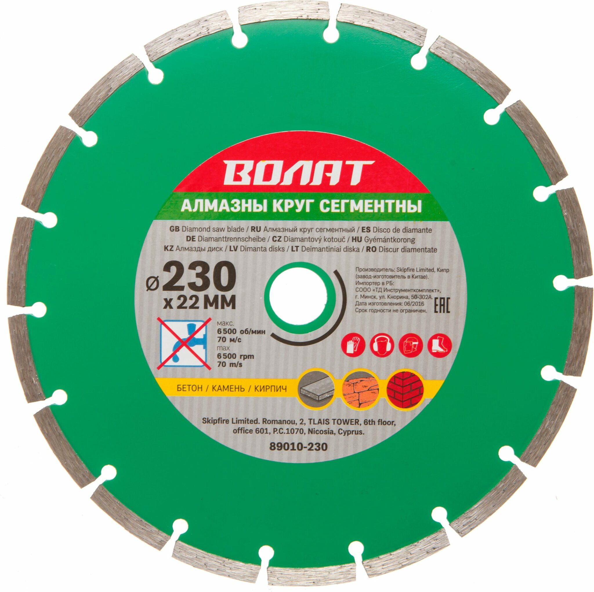 Круг алмазный 230х22 мм сегментный ВОЛАТ (89010-230) сегментный для сухой резки асфальтового полотна, бетона, гранита, кирпича, камня и других твердых материалов. Высокая скорость резания, точная резка. Сухой рез.