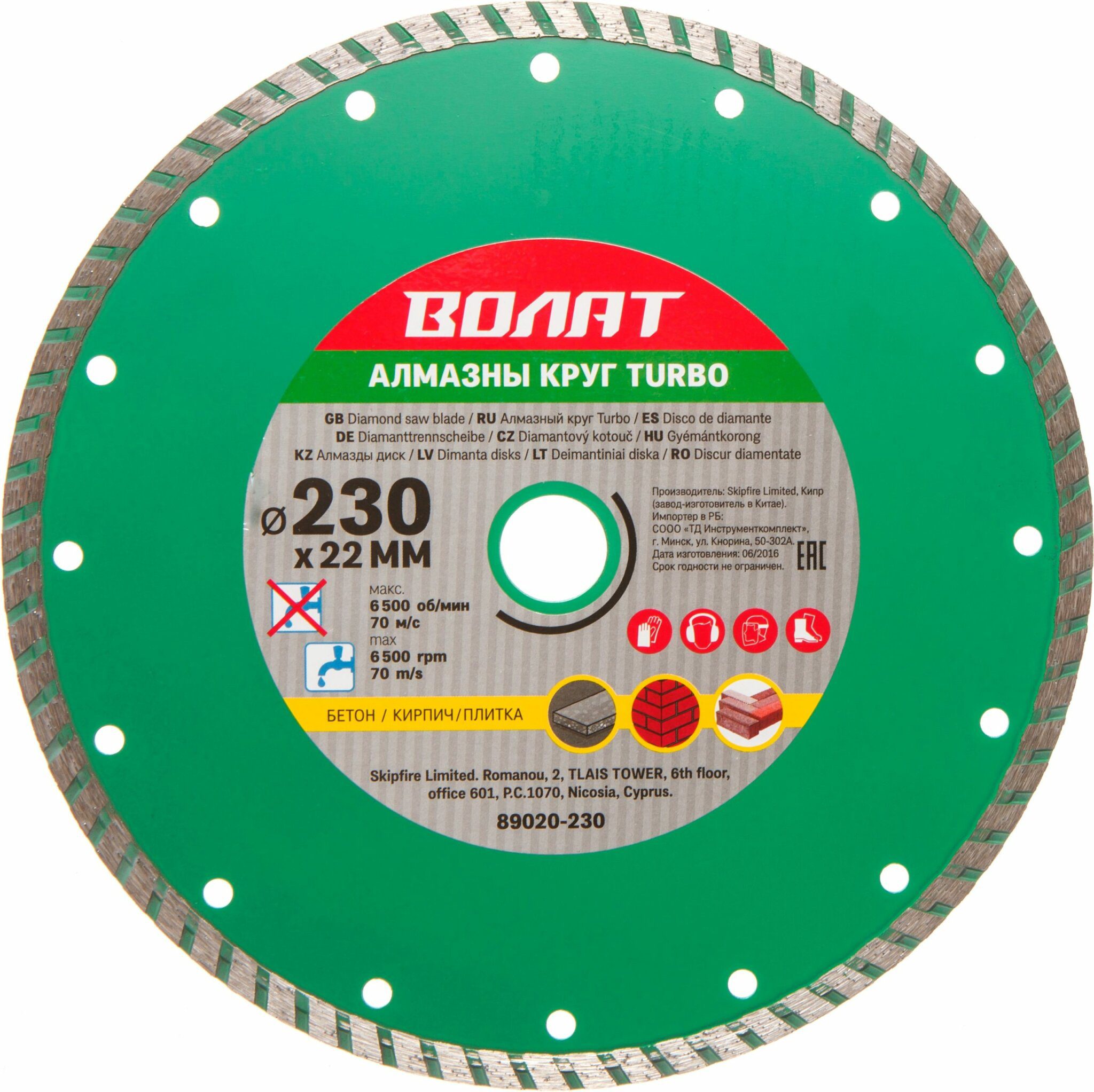 Круг алмазный 230х22 мм TURBO ВОЛАТ (89020-230) подходит для обработки большинства строительных материалов. TURBO режущая кромка для более точных и чистых резов. Может использоваться как оснастка для углошлифмашин, бороздоделов и прочего совместимого инструмента.