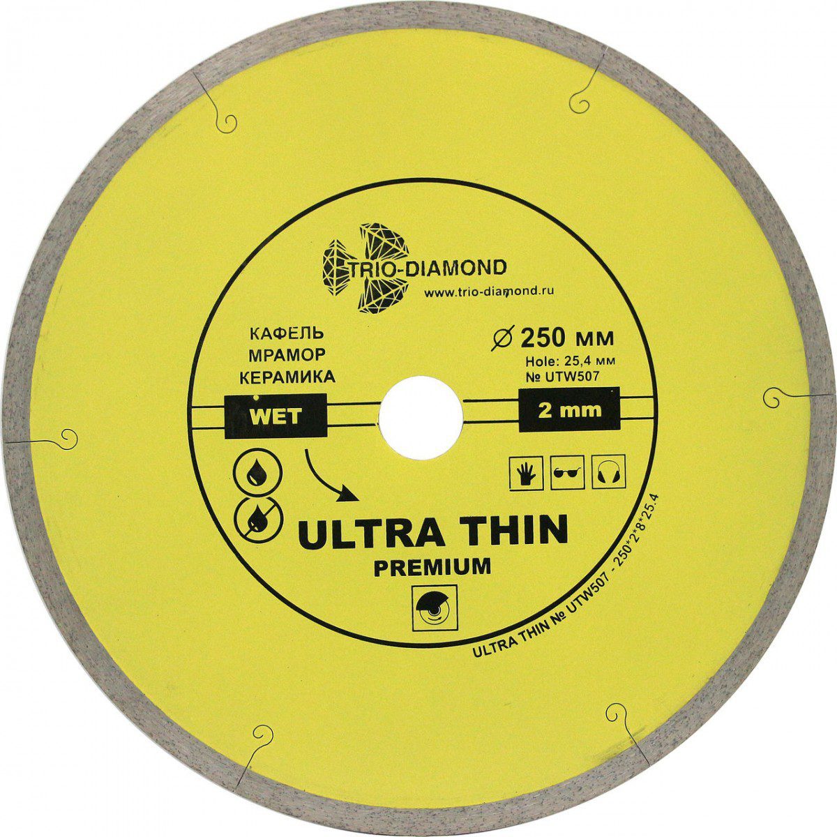 Круг алмазный 250х25,4 мм TRIO-DIAMOND Hot Press ультратонкий (UTW507) отличается от обычного сплошного толщиной, что дает еще более гладкий рез, а также прорези на теле диска создают дополнительное охлаждение, что позволяет применять как влажную так и сухую резку.
