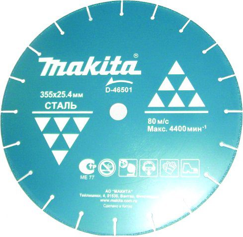 Круг алмазный 355×25,4 мм сегментированный по металлу MAKITA (D-46501) сухая резка. Предназначен для работы с отрезной пилой модели MAKITA 2414NB.