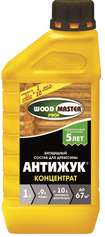 Антисептик WOODMASTER Антижук-концентрат 1 л – биоцидный пропиточный состав для древесины. Защита древесину, находящуюся в нормальных условиях эксплуатации (I – VIII классы условий службы по ГОСТ 20022.2-80) от биопоражений (гниения, плесени, грибка, синевы) и насекомых-вредителей. Уничтожает личинок деревопоражающих насекомых. Защищает минеральные поверхностей от биопоражений (плесени, грибка).