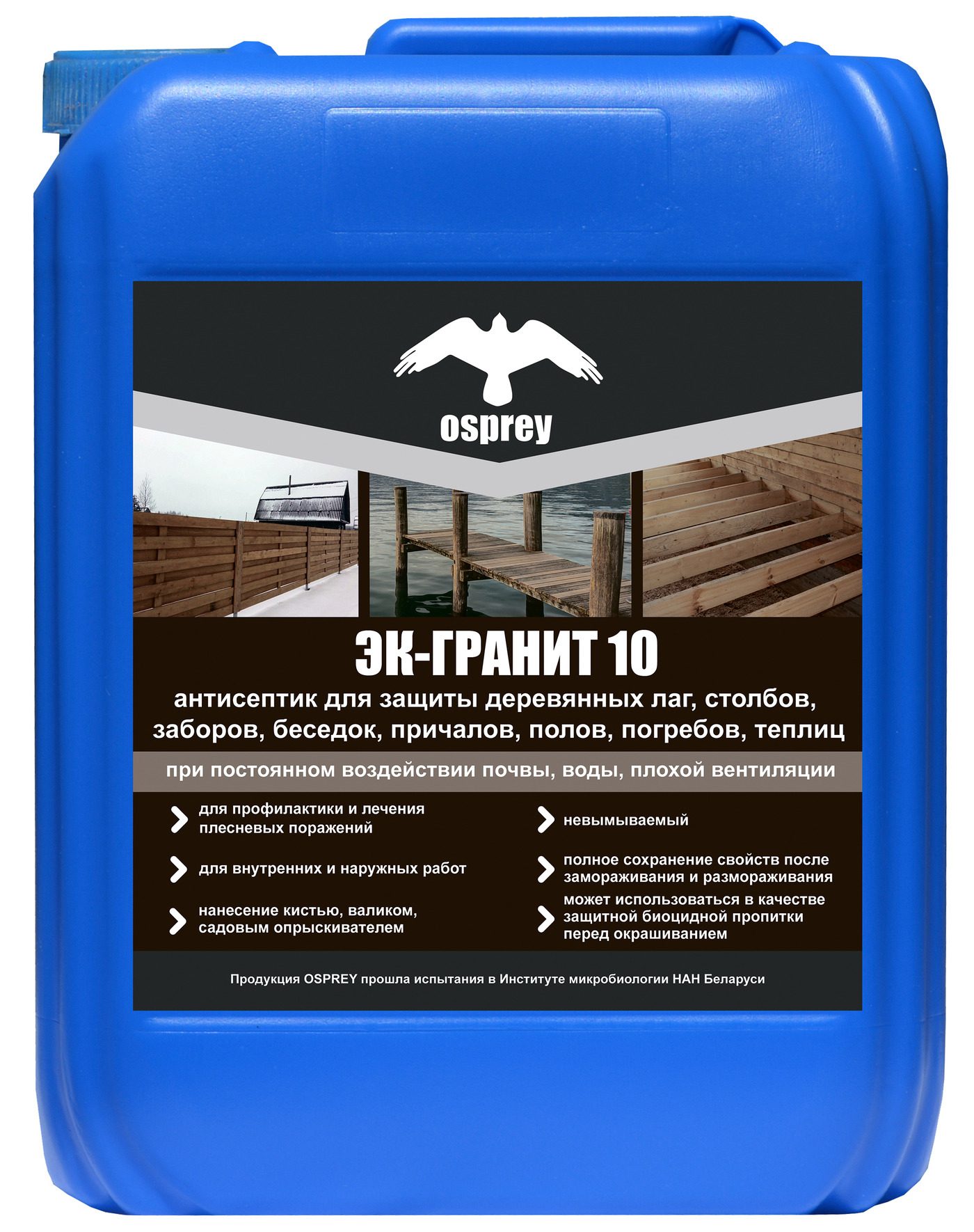 Антисептик OSPREY ЭК-Гранит 10 % 10 л для древесины для тяжёлых условий эксплуатации при постоянном воздействии почвы, воды, плохой вентиляции, контакте с грунтом. Применяется для профилактики и лечения от плесневелых грибов. Для внутренних и наружных работ. Может использоваться в качестве защитной биоцидной пропитки перед окрашиванием. Невымываемый. Применяют для обработки новых и ранее обработанных антисептиком ответственных труднодоступных деревянных балок, несущих брусьев, перекрытий шпал, лаг, нижних и верхних венцов настилов по грунту, скрытых конструкций, столбов, заборов и оград, причалов, погребов, животноводческих ферм, овощехранилищ, рудничных стоек долговременной службы, теплиц и других пиленых, строганных и бревенчатых элементов конструкций жилищного, общественного, производственного и сельскохозяйственного назначения (класс условий службы I-XVI), подверженных активному биоразрушению.