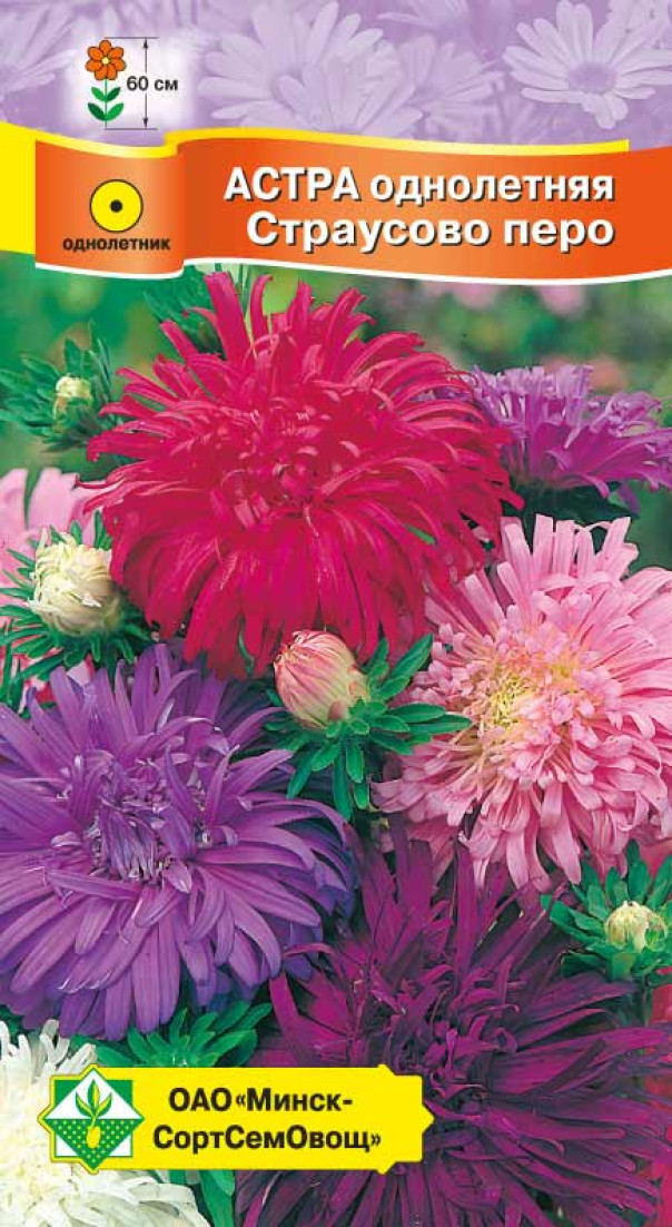 Семена астры Страусово перо МИНСКСОРТСЕМОВОЩ 0,3 г – декоративная обильноцветущая группа. Смесь сортов. Среднераннего срока цветения. Куст широкий, раскидистый, высотой около 60 см. Цветоносы слабооблиственные, до 40 см длиной. Соцветия махровые, плоско-округлые, в диаметре 10-12 см. На кусте до 20 цветущих соцветий. Используется для клумб и срезки. Посев на рассаду производят с конца марта до середины апреля. В открытый грунт рассаду высаживают в мае на солнечное место.