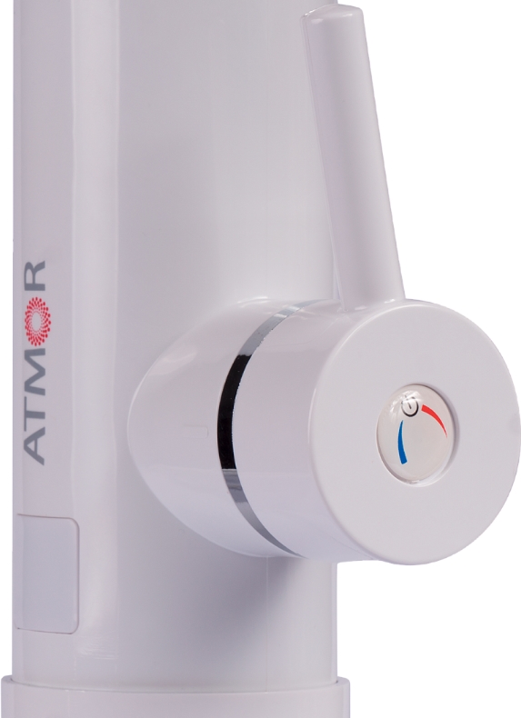 Водонагреватель проточный ATMOR Tap 3 KW Tap монтируется на раковину. Оборудован светодиодным индикатором температуры. Регулировочная ручка работает в двух режимах: набора воды (“холодная вода”) и подогрева воды (“горячая вода”). Температура горячей воды регулируется термостатом, который также является устройством безопасности, предотвращающим опасный перегрев.