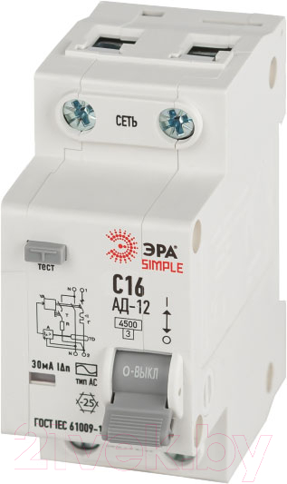 АВДТ 4,5кА ЭРА SIMPLE D12E2C16AC30 АД-12 электронное 1P+N С16 30мА тип АС