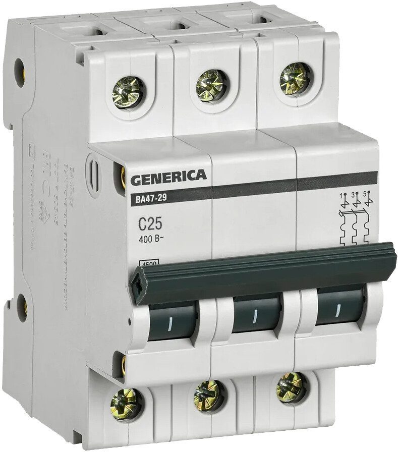 Автоматический выключатель GENERICA ВА47-29 3Р 25А С 4,5кА предназначен для защиты распределительных и групповых цепей, имеющих различную нагрузку: – электроприборы, освещение – выключатели с характеристикой В, – двигатели с небольшими пусковыми токами (компрессор, вентилятор) – выключатели с характеристикой C, – двигатели с большими пусковыми токами (подъемные механизмы, насосы) – выключатели с характеристикой D. Автоматические выключатели ВА47-29 рекомендуются к применению в вводно-распределительных устройствах для жилых и общественных зданий. Усовершенствованная дугогасительная система: увеличенный срок службы, повышенная устойчивость к токам короткого замыкания. Возможность одновременного присоединения шиной FORK и гибким проводником для распределения питания цепи через верхние зажимы, а также возможность соединения шиной PIN. Наличие индикатора положения контактов. Широкий диапазон рабочих температур от -40 до +50 °С. Новый эргономичный дизайн рукоятки включения/выключения. Насечки на контактных зажимах снижают тепловые потери и увеличивают механическую устойчивость соединения.