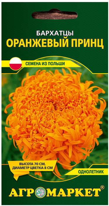 Семена бархатцев прямостоячих Оранжевый принц АГРОМАРКЕТ 0,2 г – это однолетнее, теплолюбивое растение, высаживается весной, когда минует угроза заморозков. Неприхотливый цветок, легко переносит жару, быстро растет и любит свет. Используются для оформления приусадебного участка, клумб, рабаток, садовых ваз, букета. Оказывают положительное воздействие на почву. Цветки с большим диаметром 8-10 см, махровые, ярко-оранжевого окраса. Прямой стебель достигает высоты до 80 см.
