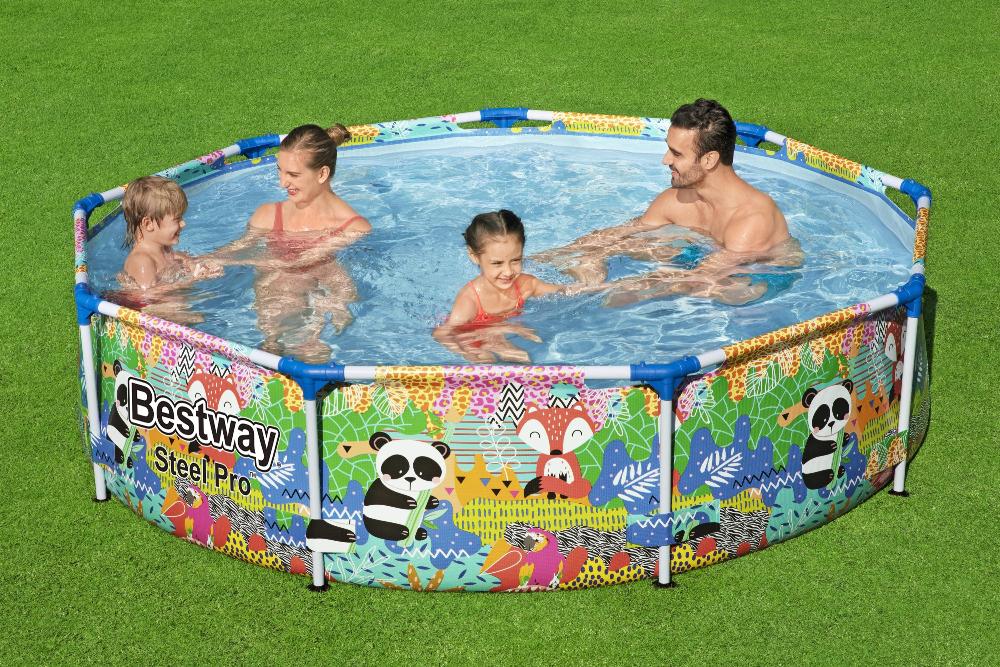 Бассейн BESTWAY Steel Pro 5612F (274×66) отличается яркой расцветкой. Чаша выполнена из высококачественного трехслойного ПВХ: два слоя плотного винила и между ними сетка из полиэстера для особой прочности. Цвет чаши бассейна снаружи разноцветный с элементами джунглей и диких животных. Каркас металлический, покрытый предотвращающим появление коррозии слоем пластика. Не требует бетонирования и подготовки ямы, все, что нужно, это плоская, горизонтальная площадка. Сезонный бассейн (рекомендуется разбирать на холодное время года) обладает простой конструкцией – может быть легко разобран и собран заново. Объём бассейна (90%): 3221 л.