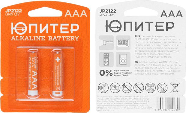 Батарейка ААА ЮПИТЕР 1,5 V алкалиновая 2 штуки (JP2122) применяется в бытовых электроприборах с высоким током потребления. Не содержит ртути и кадмия. При хранении батареи в комнатных условиях потери емкости не превышают 10%.
