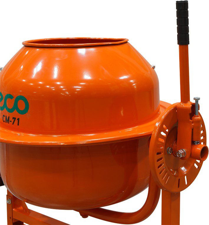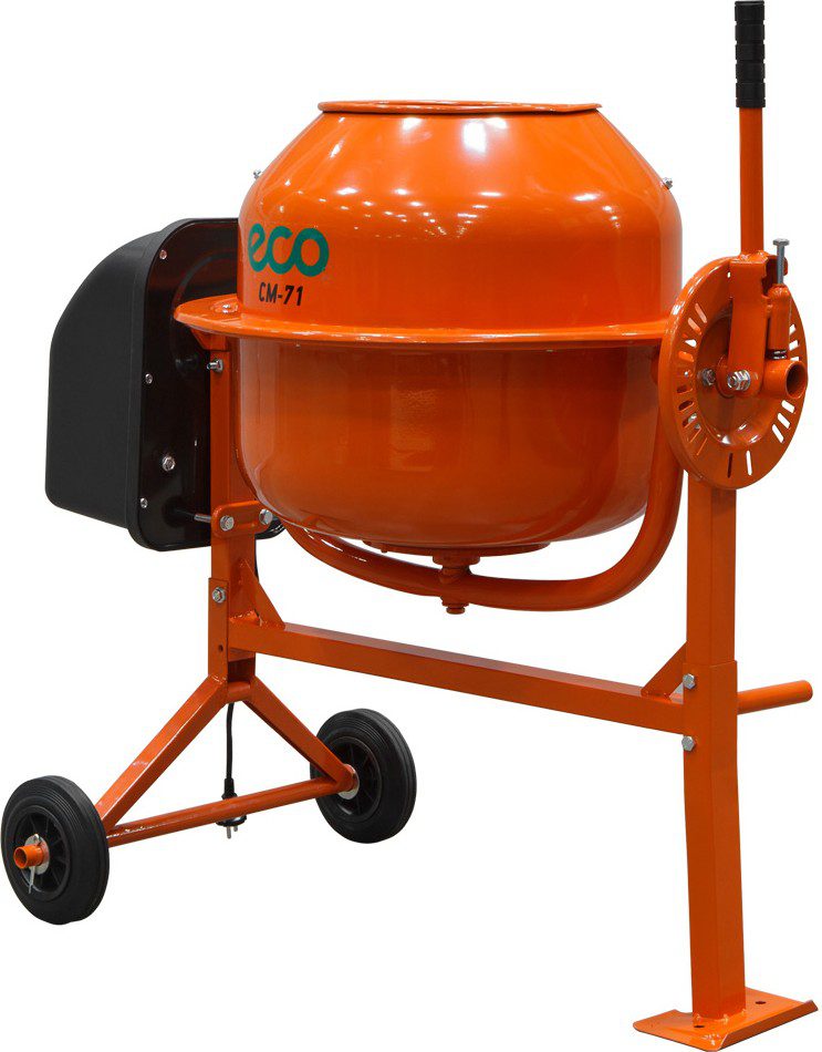 Бетономешалка ECO CM-71 имеет электромагнитный включатель с системой защиты от случайного включения и асинхронный двигатель с воздушным охлаждением. Чаша удобно опрокидывается путем отклонения рулевого колеса, опорная рама изготовлена из прочного материала. Ведущая и ведомая шестерни изготовлены из чугуна. Высокопрочный приводной ремень ручейкового типа усилен синтетическим армирующим кордом, что обеспечивает долговечность и надежность.