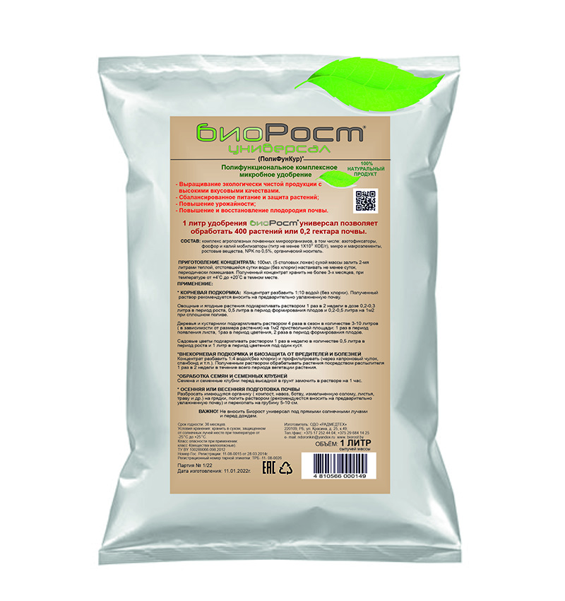 Микробиологическое удобрение “Биорост” ПолиФунКур для приготовления почвосмесей, добавления в лунки при посадке растений в почву, корневых и внекорневых подкормок рассады, овощных и плодово-ягодных культур, садовых цветов, а также для приготовления компоста высокого качества, повышения плодородия почвы. Повышает урожайность, улучшает вкус и качество выращенной продукции. Повышает активное плодородие почвы, восстанавливает и оздоравливает почвенную микрофлору, способствует разуплотнению почвы и улучшению ее структуры. Максимальный эффект получается при совместном применении удобрения Биорост с органическими удобрениями (навоз, компост) или сидератами – обработке их рабочим раствором удобрения Биорост перед заделкой в почву. При этом микроорганизмы быстро (за 2-4 недели) и полностью разлагают органику, благодаря чему происходит ускоренное накопление гумуса в почве.