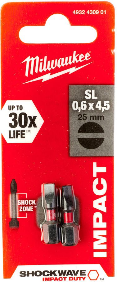 Бита для шуруповерта ударная SL0,6×4,5 25 мм 2 штуки MILWAUKEE Shockwave (4932430901) идеально подходит не только для работ импульсным гайковертом, но для любых видов работ по сверлению и закручиванию. Геометрия Shock Zone разработана для Flex. Shock Zone уменьшает давление на наконечник насадки и снижает риск поломки. Дизайн Shock Zone и специальная термообработка поглощают удары и делают насадку более эластичной. Компрессионный кованый наконечник обеспечивает отличную посадку в головку винта.