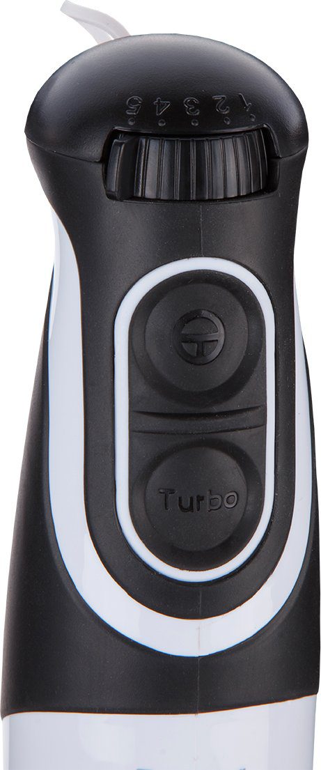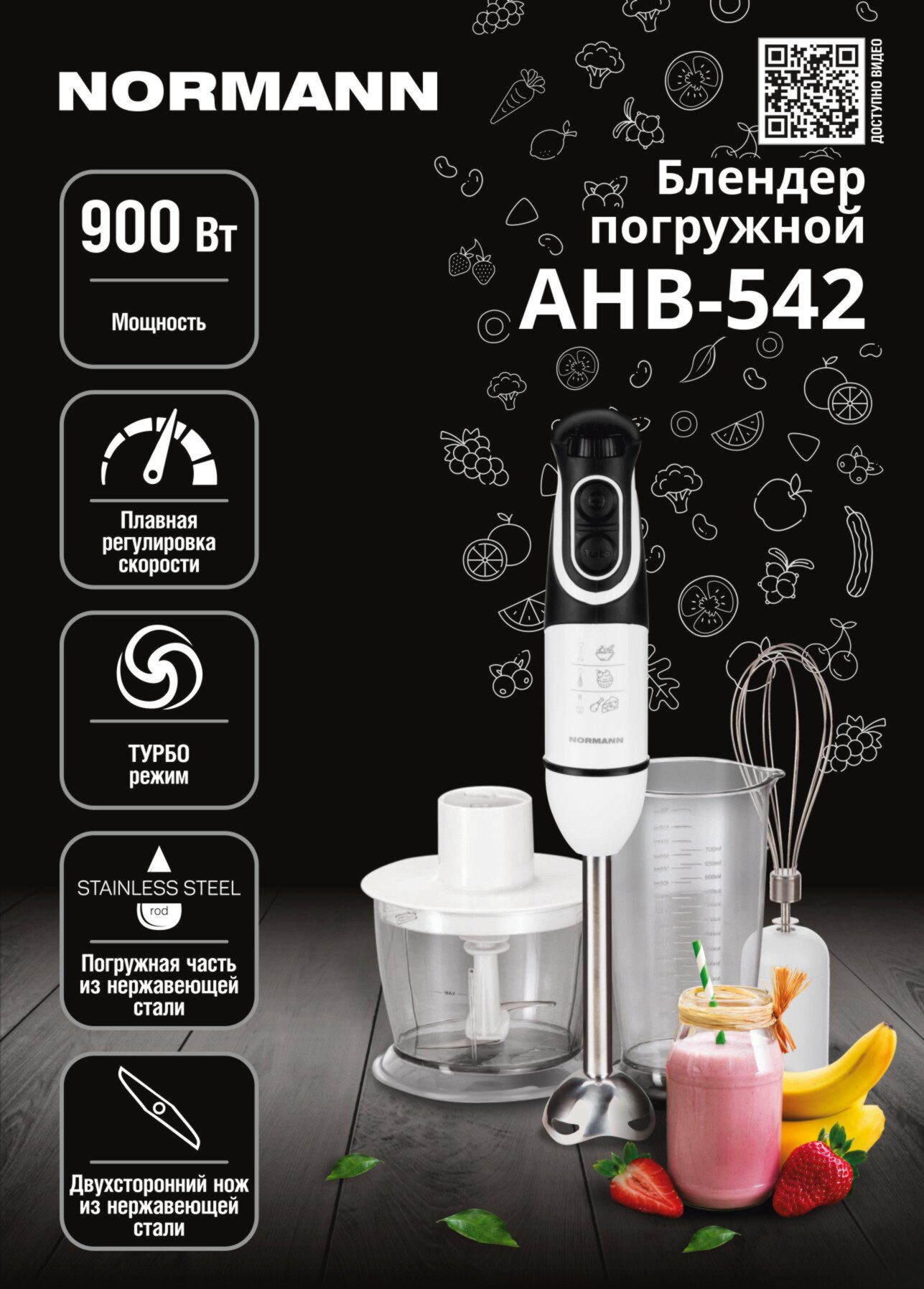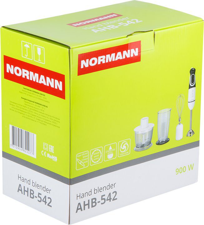 Блендер NORMANN AHB-542 – погружной блендер мощностью 900 Вт. Он станет незаменимым помощником на вашей кухне. Предназначен для быстрого измельчения продуктов. Отлично подойдет для приготовления молочных коктейлей, фруктовых напитков, смешивания соусов. Прибор оснащен поворотным регулятором скорости. Блендер имеет импульсный режим ‒ способ обработки особо твердых продуктов. Также есть режим Турбо, он включается в конце процесса приготовления для скорейшего и качественного завершения работы. Турборежим позволяет быстро превратить в пюре особо мягкие и нежные продукты.Погружная часть и нож прибора выполнены из нержавеющей стали. В комплекте идет измельчитель объемом 500 мл, мерный стакан 700 мл с крышкой, венчик для взбивания и смешивания жидких продуктов.