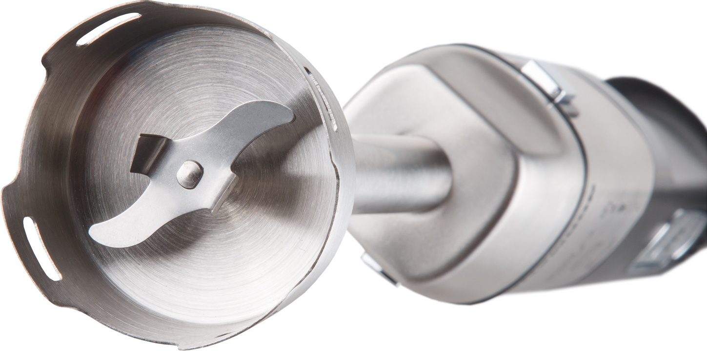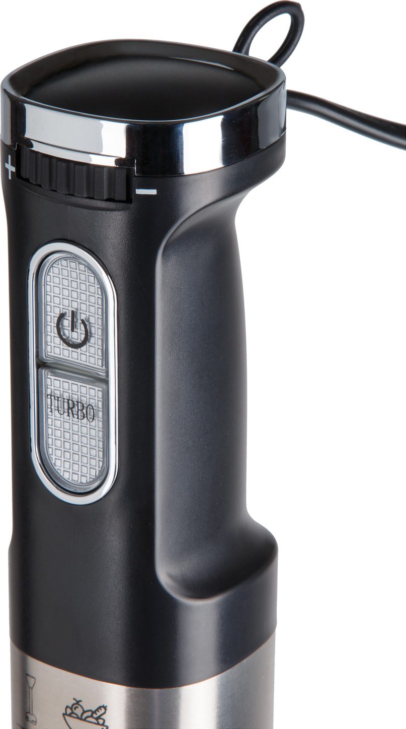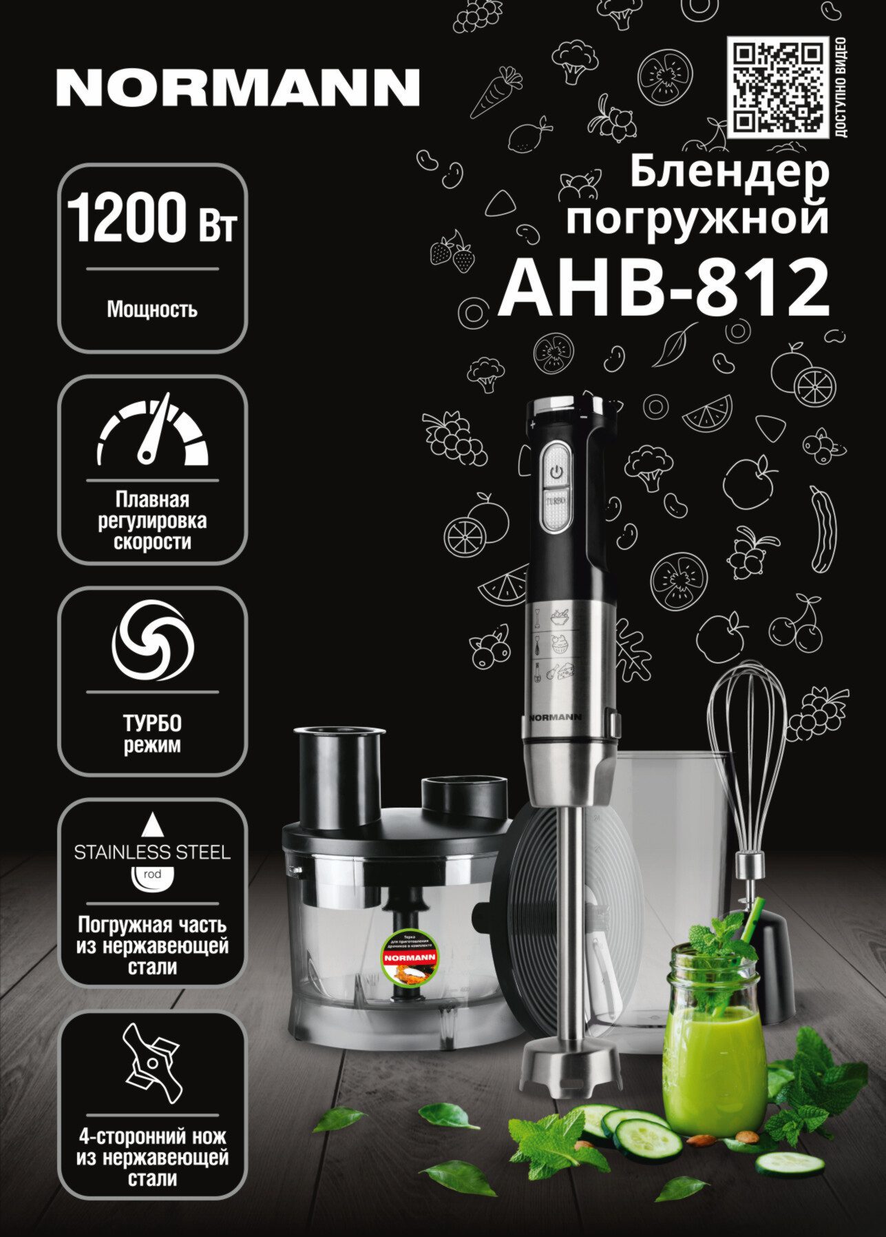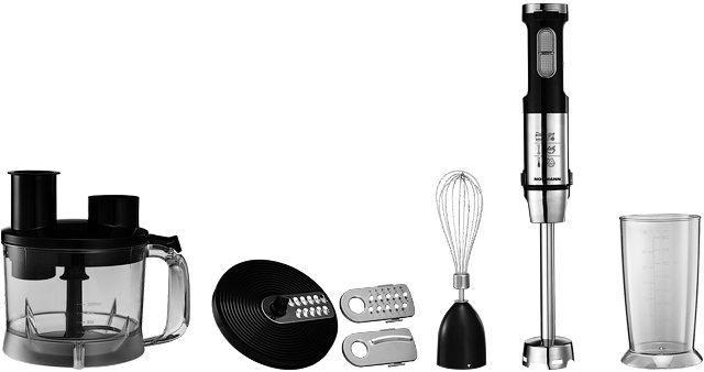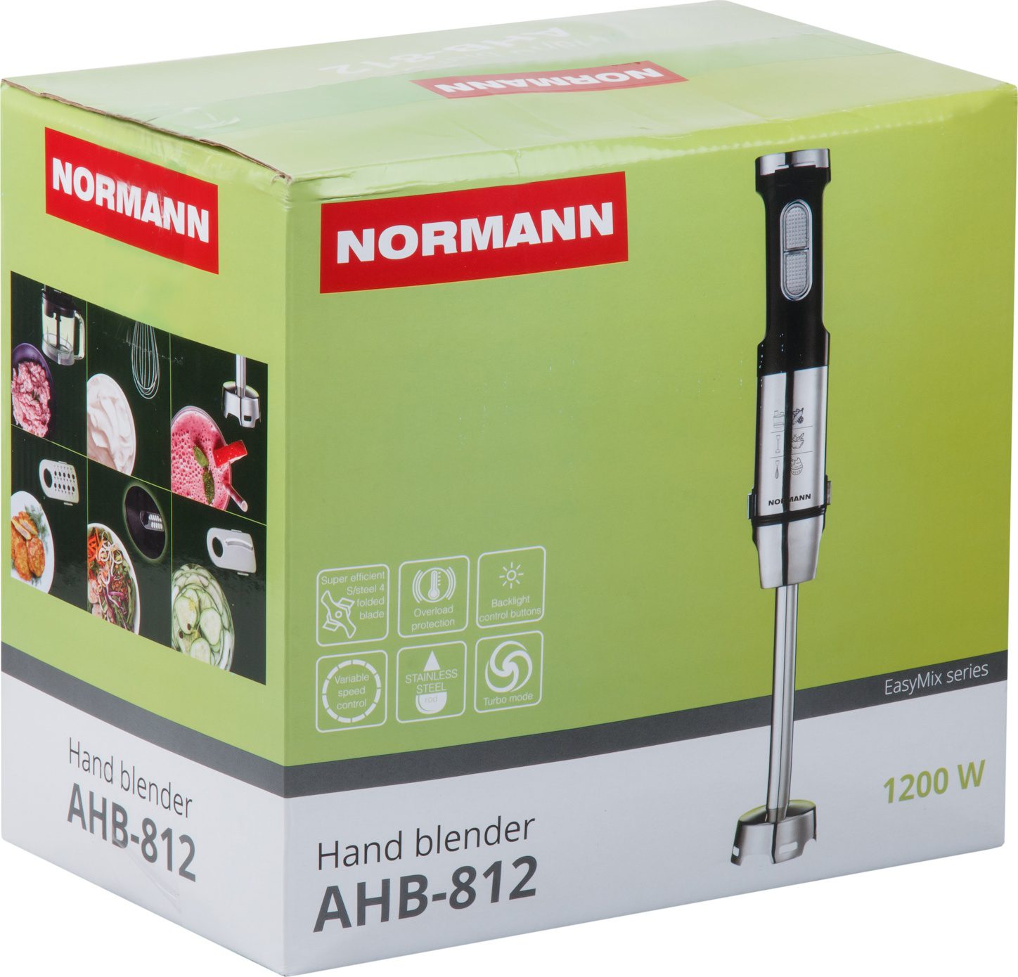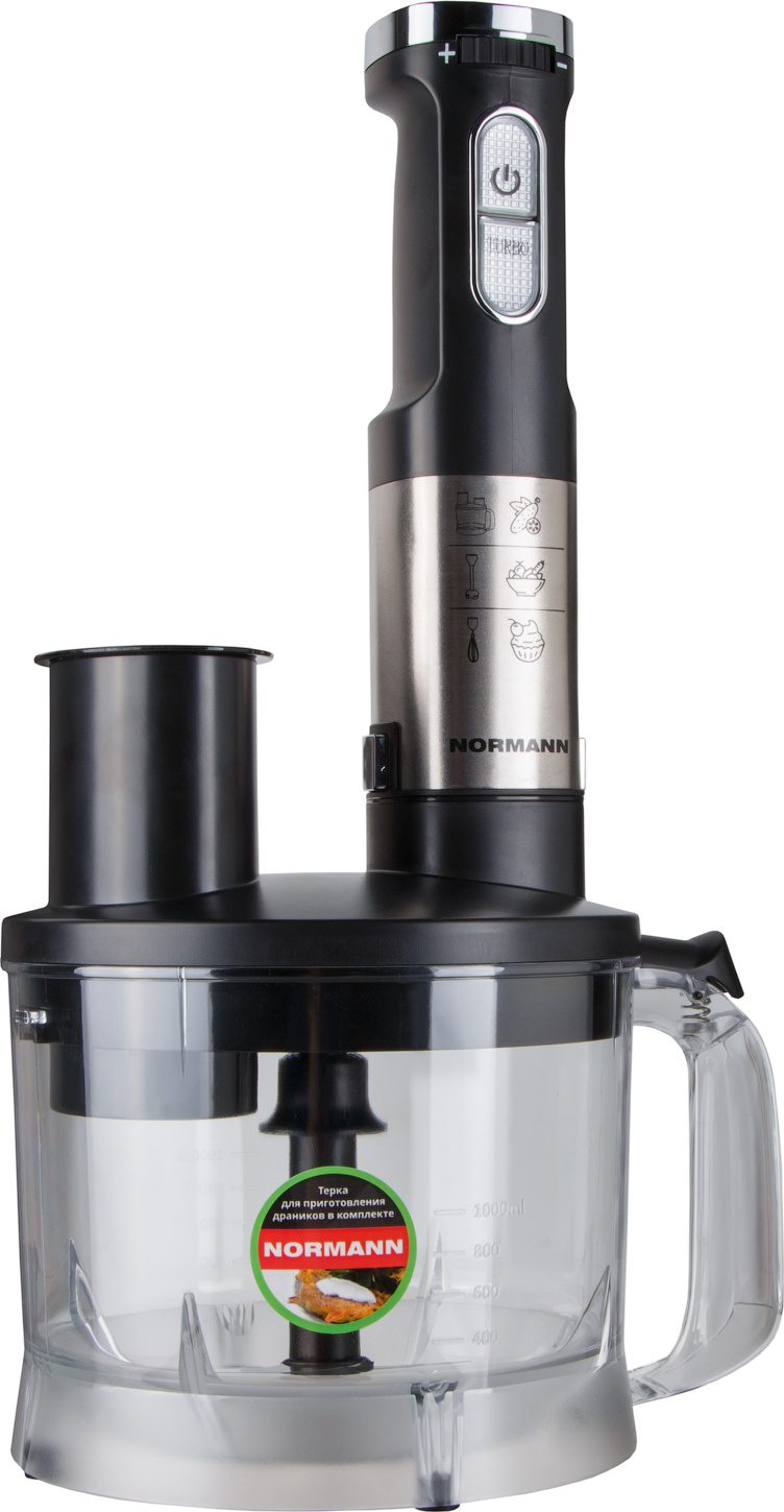 Блендер NORMANN AHB-812 ‒ погружной блендер мощностью 1200 Вт. Станет незаменимым помощником на вашей кухне. Корпус погружной части и нож выполнены из нержавеющей стали. В комплекте идет мерный стакан 800 мл, венчик для взбивания и смешивания жидких продуктов, а также чаша кухонного комбайна 1,4 л и вращающийся диск с тремя терками (терка для драников, крупная терка и шинковка). Блендер оснащен поворотным регулятором скорости и подсветкой кнопок управления. Турборежим позволяет быстро превратить в пюре особо мягкие и нежные продукты. Он включается в конце процесса приготовления для скорейшего и качественного завершения работы. Данный прибор оснащен защитой от перегрузок. При перегреве блендер автоматически отключается.