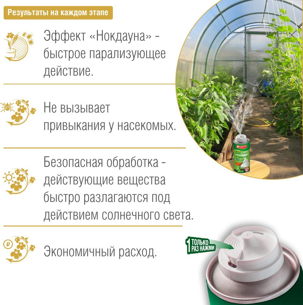Фоггер можно использовать от: белокрылки, грибных комариков-сциарид, гусениц (моли, совки, листовертки), долгоносиков, златки, клопов, листоедов, ложнощитовки, минирующих мушек, многоножки, моли, мух, паутинного клеща, пилильщиков, совок, тли, трипсов, трубковерта, уховертки, цветоедов, червецов, щелкунов, щитовки. Одного средства хватает для разового избавления от насекомых в помещениях площадью до 100 м².