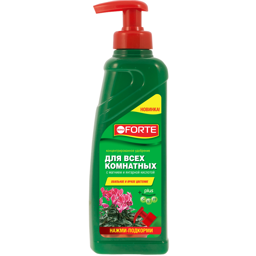 Удобрение минеральное BONA FORTE Для всех комнатных растений 285 мл для усиления декоративности и стимулирования роста растений. Подходит для диффенбахии, драцены, замиокулькаса, маранты, монстеры, плюща, сансевиерии, фатсии, фикусов, филодендрона, антуриума, бальзамина, бегонии, гардении, герани, гибискуса, камелии, кливии, спатифиллума, фиалки, фуксии, хойи, цикламена, юкки и многих других. Удобрение содержит полный комплекс веществ, необходимых для полноценного и сбалансированного питания растений.