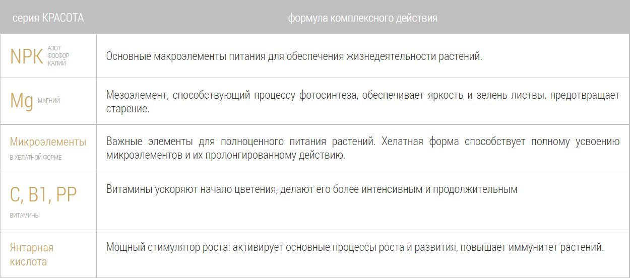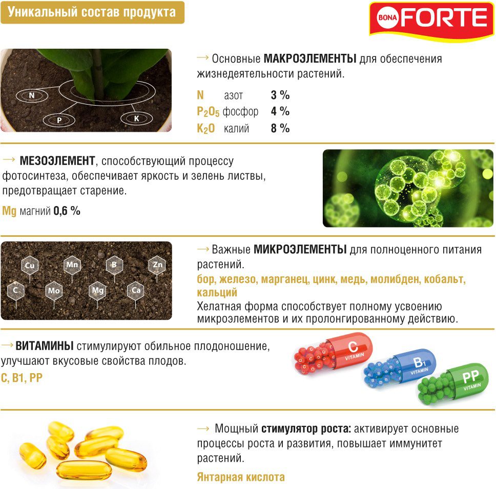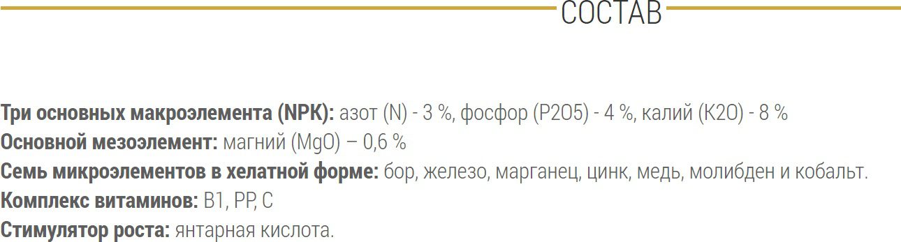 Три основных макроэлемента (NPK): азот (N) – 3 %, фосфор (P2O5) – 4 %, калий (K2O) – 8 %. Основной мезоэлемент: магний (MgO) – 0,6 %. Семь микроэлементов в хелатной форме: бор, железо, марганец, цинк, медь, молибден и кобальт. Комплекс витаминов: B1, PP, С. Стимулятор роста: янтарная кислота.