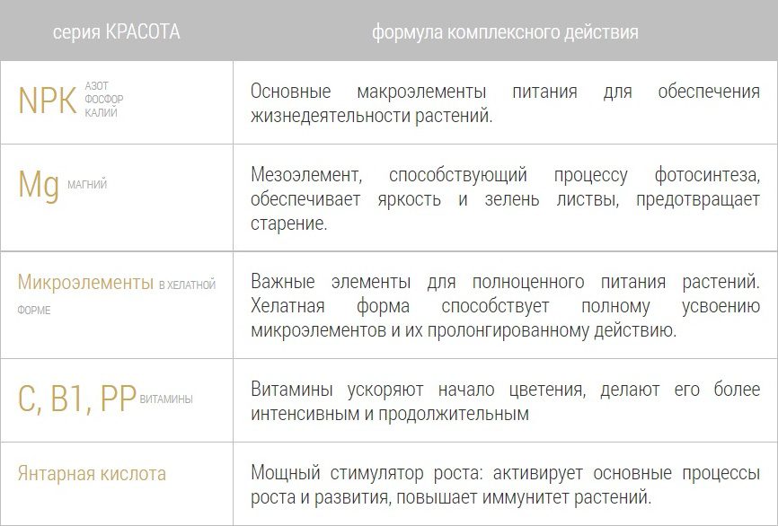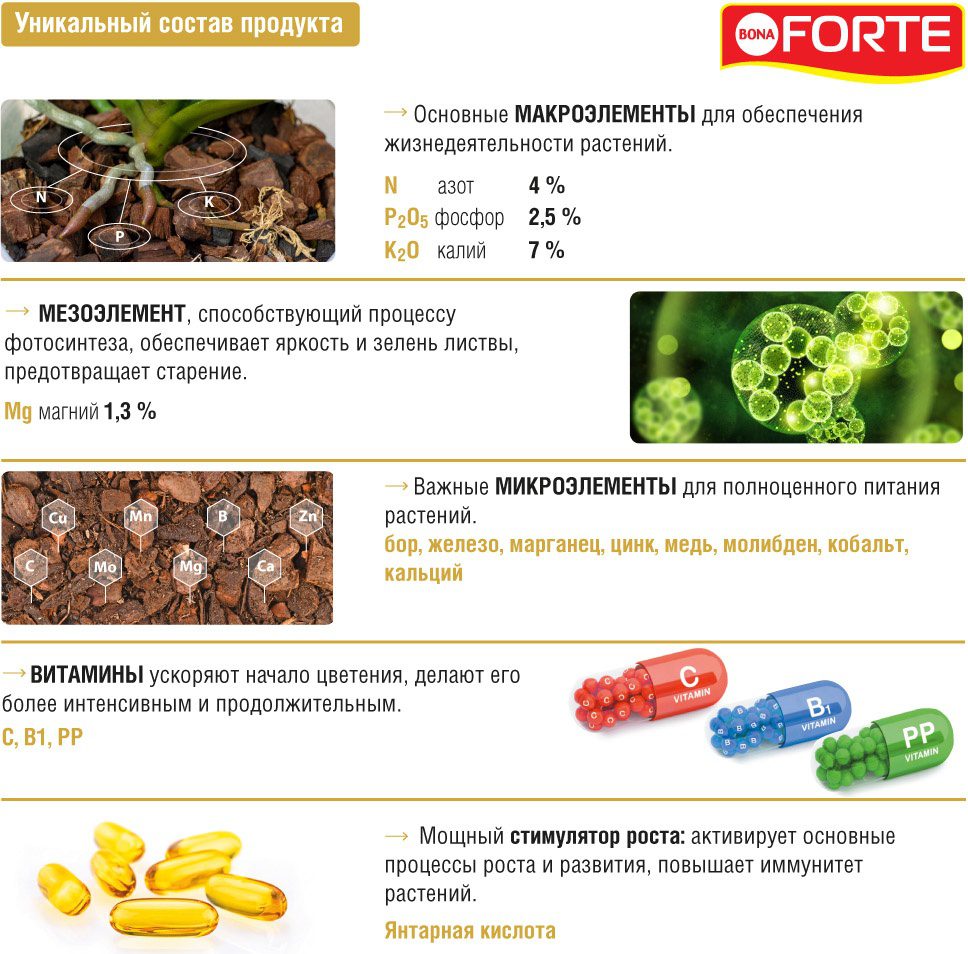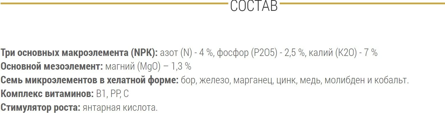 Три основных макроэлемента (NPK): азот (N) – 4 %, фосфор (P2O5) – 2,5 %, калий (K2O) – 7 %. Основной мезоэлемент: магний (MgO) – 1,3 %. Семь микроэлементов в хелатной форме: бор, железо, марганец, цинк, медь, молибден и кобальт. Комплекс витаминов: B1, PP, С. Стимулятор роста: янтарная кислота.