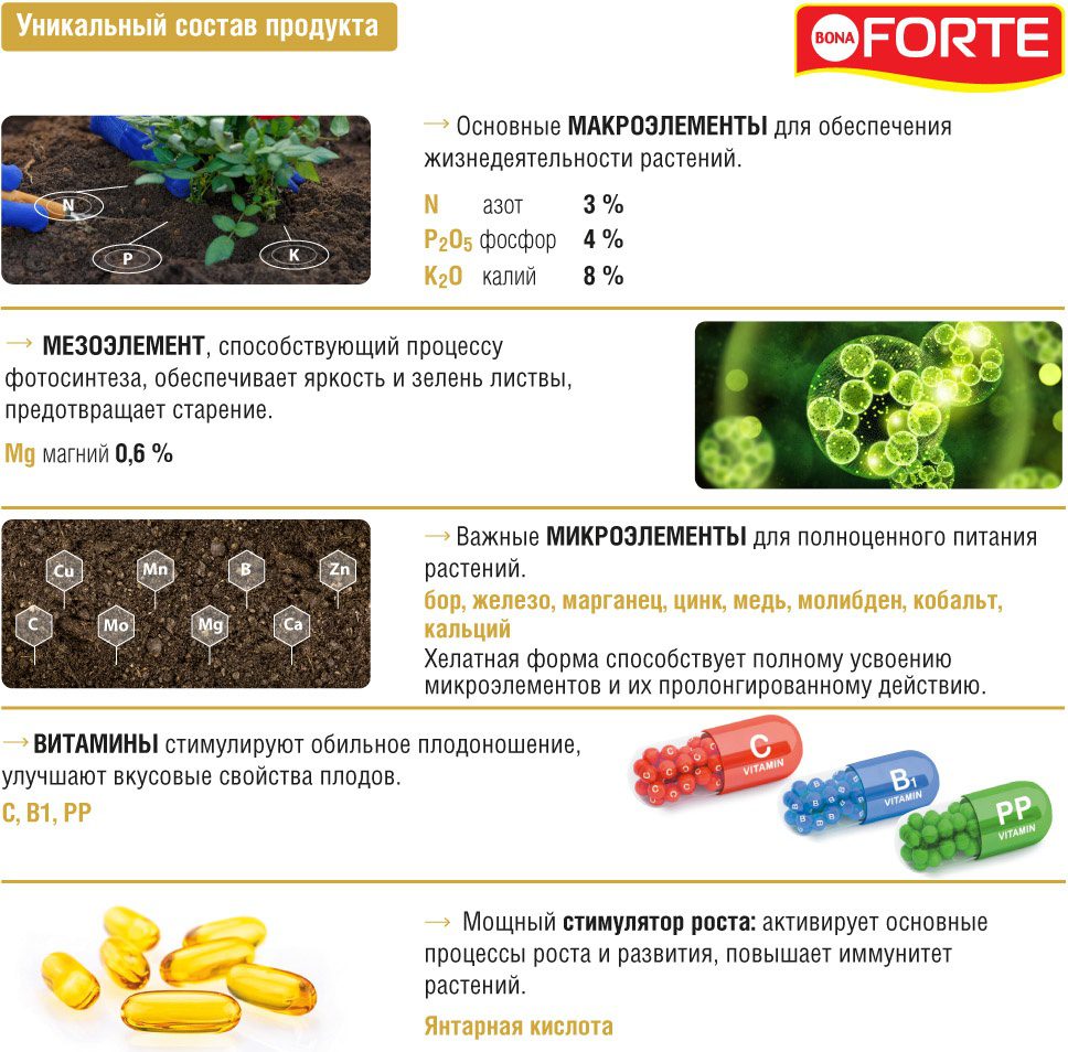 Три основных макроэлемента (NPK): азот (N) – 3 %, фосфор (P2O5) – 4 %, калий (K2O) – 8 %. Основной мезоэлемент: магний (MgO) – 0,6 %. Семь микроэлементов в хелатной форме: бор, железо, марганец, цинк, медь, молибден и кобальт. Комплекс витаминов: B1, PP, С. Стимулятор роста: янтарная кислота.