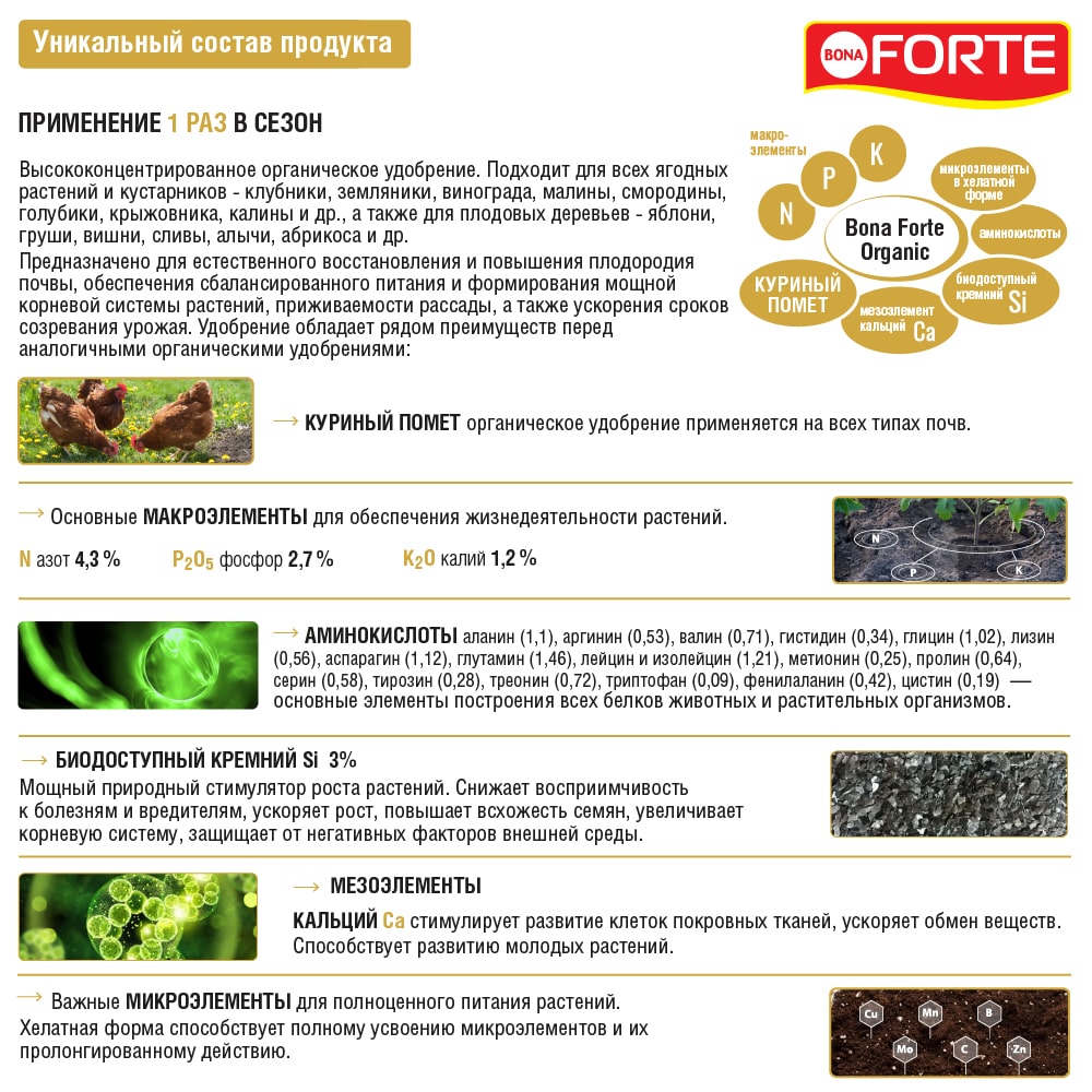 Высококонцентрированное органическое удобрение. Подходит для всех ягодных растений и кустарников – клубники, земляники, винограда, малины, смородины, голубики, крыжовника, калины и др., а также для плодовых деревьев – яблони, груши, вишни, сливы, алычи, абрикоса и др. Предназначено для естественного восстановления и повышения плодородия почвы, обеспечения сбалансированного питания и формирования мощной корневой системы растений, приживаемости рассады, а также ускорения сроков созревания урожая. Удобрение обладает рядом преимуществ перед аналогичными органическими удобрениями: