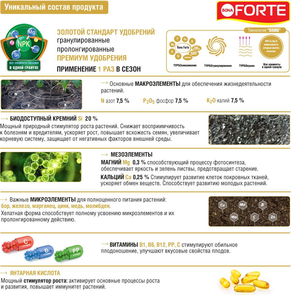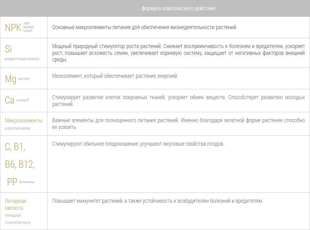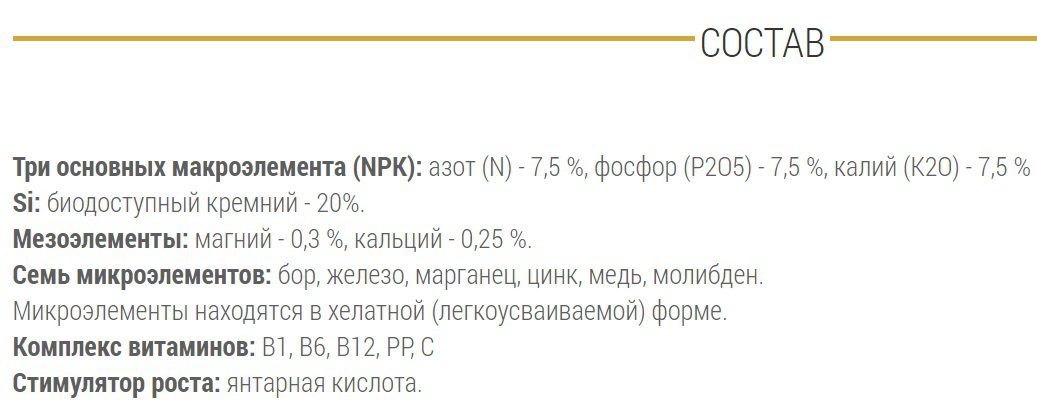 Три основных макроэлемента (NPK): азот (N) – 7,5 %, фосфор (P2O5) – 7,5 %, калий (K2O) – 7,5 %. Si: биодоступный кремний – 20%. Мезоэлементы: магний – 0,3 %, кальций – 0,25 %. Семь микроэлементов: бор, железо, марганец, цинк, медь, молибден. Микроэлементы находятся в хелатной (легкоусваиваемой) форме. Комплекс витаминов: B1, В6, В12, PP, С. Стимулятор роста: янтарная кислота.