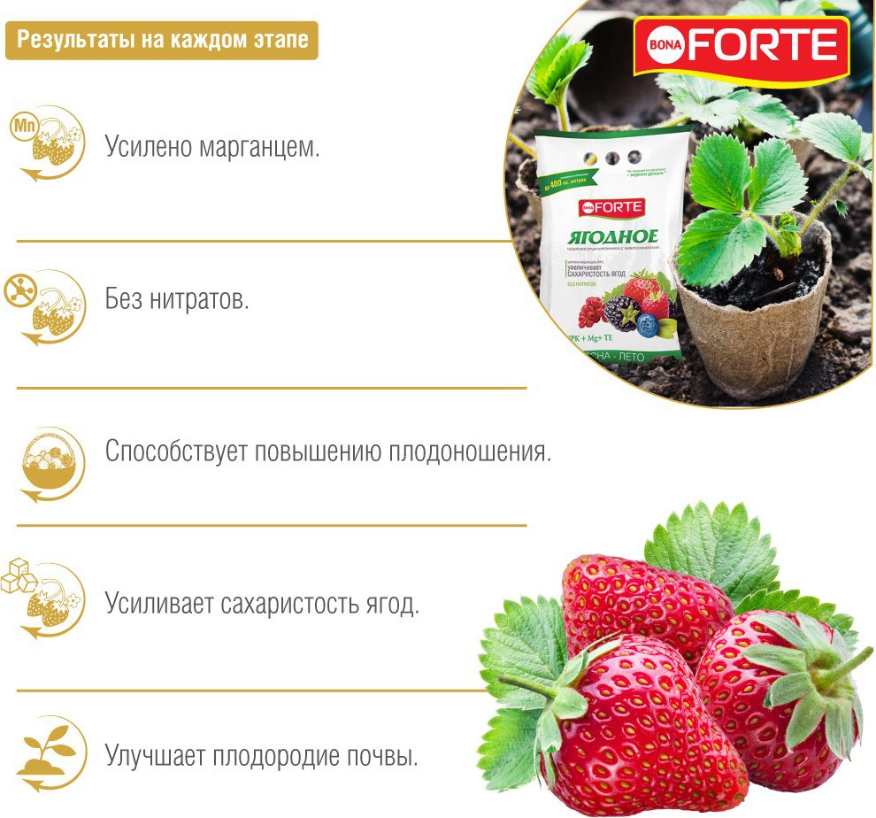 Удобрение минеральное BONA FORTE Ягодное 2,5 кг (BF23010241) ‒ гранулированное минеральное удобрение с микроэлементами. Равномерное внесение – содержание всех компонентов в одной грануле обеспечивает 100 % попадание каждого элемента питания растению. Хорошая растворимость обеспечивает быстрый эффект при применении удобрения. Экономичное расходование. Удобрение содержит основные элементы питания в легкоусвояемой форме и сбалансированном соотношении, способствует хорошему росту растений и получению высокого урожая. Увеличивает сахаристость ягод.