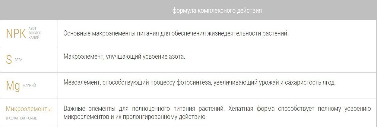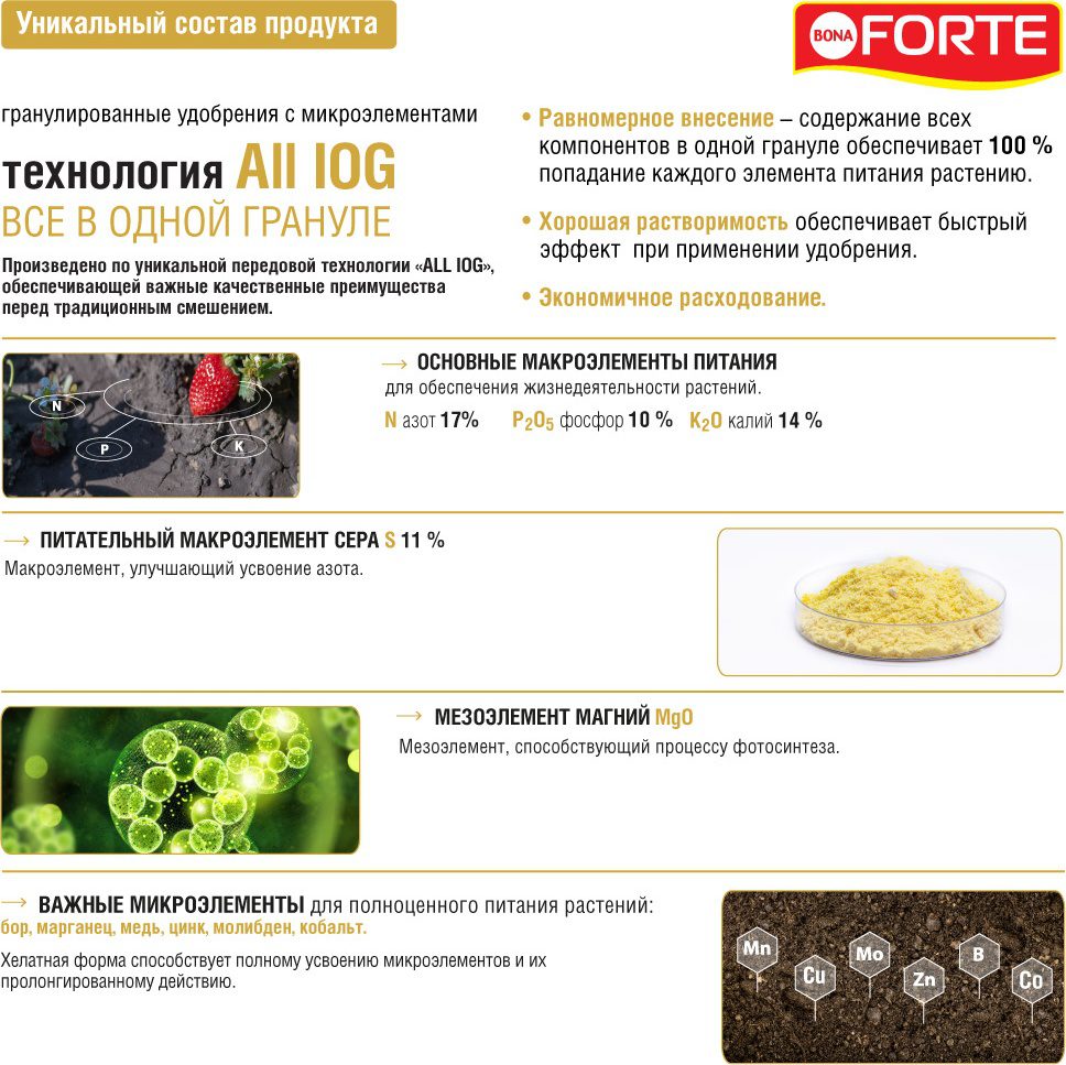 Состав: три основных макроэлемента (NPK): азот (N) – 17 %, фосфор (P2O5) – 10%, калий (K2O) – 14 %. Питательный макроэлемент сера (S): – 13 %. Мезоэлемент: магний. Шесть микроэлементов: бор, железо, марганец, цинк, медь, молибден. Микроэлементы находятся в хелатной (легкоусваиваемой) форме.