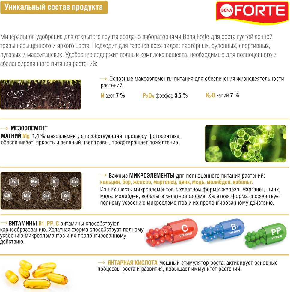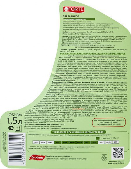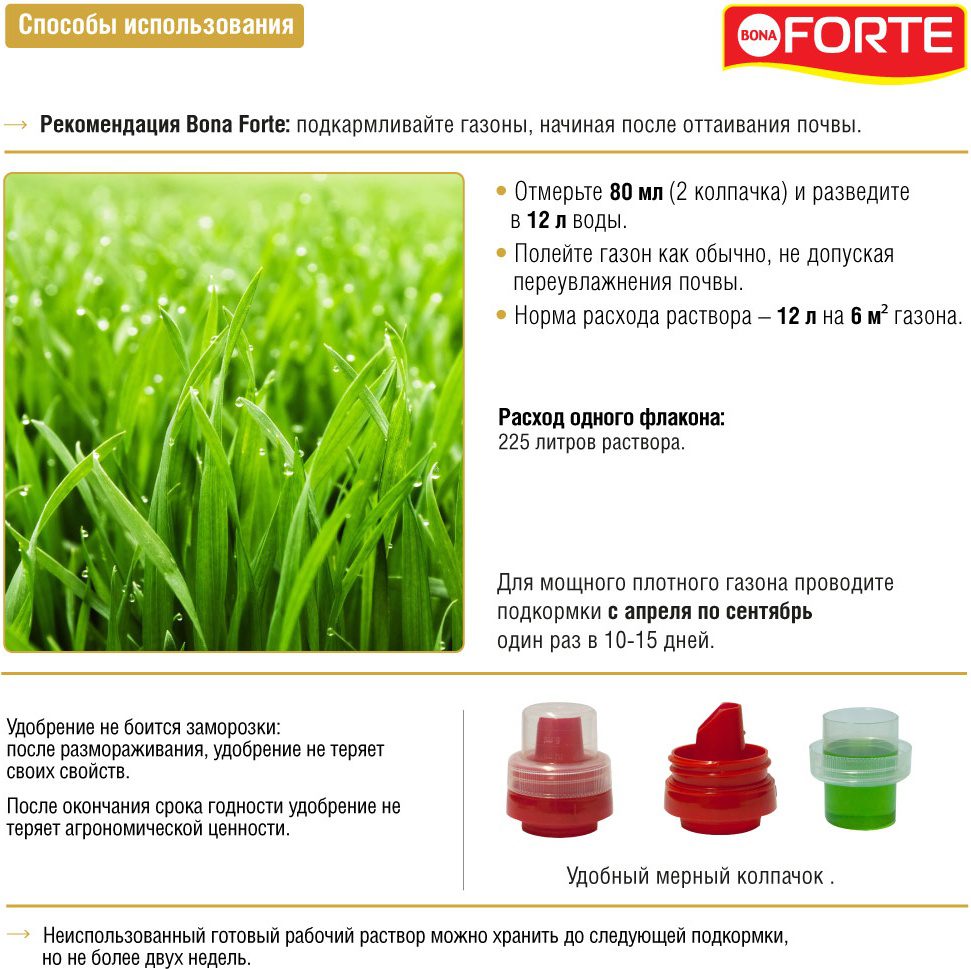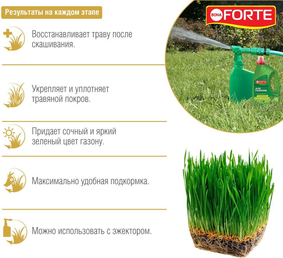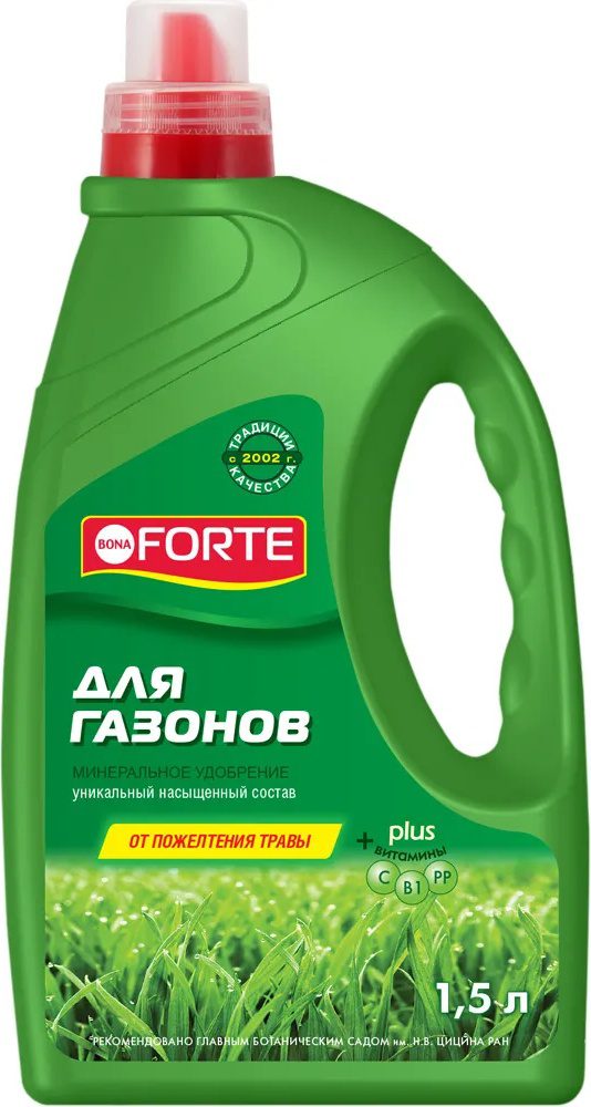 Удобрение минеральное BONA FORTE Для газонов 1,5 л (BF21040081) для роста густой сочной травы насыщенного и яркого цвета. Подходит для газонов всех видов: партерных, рулонных, спортивных, луговых и мавританских. Удобрение содержит полный комплекс веществ, необходимых для полноценного и сбалансированного питания растений.