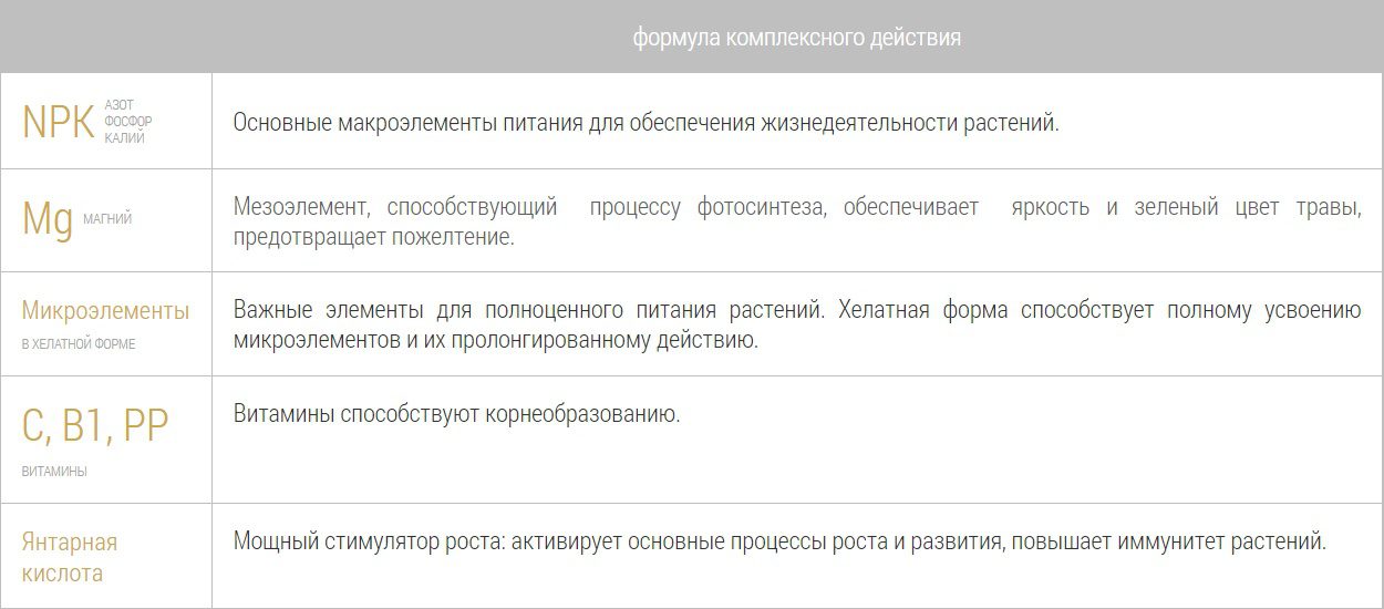 Состав: Содержит три основных макроэлемента: азот (N) — 7 %, фосфор (P2O5) — 3,5 %, калий (K2O) — 7 %. Основной мезоэлемент (Mg): магний (MgO) — 1,4 %. Девять микроэлементов: бор, железо, марганец, цинк, медь, молибден, кобальт, а также кальций и магний. Из них шесть микроэлементов в хелатной форме: (железо, марганец, цинк, медь, молибден, кобальт). Комплекс витаминов: B1, PP, С. Стимулятор роста: янтарная кислота.