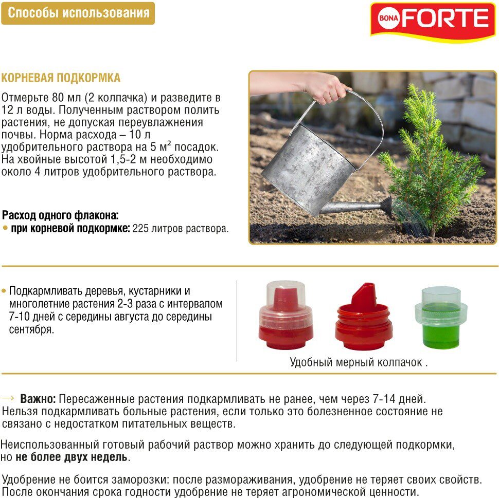 Удобрение минеральное BONA FORTE Осеннее Для хвойных 1,5 л (BF21040181) ‒ концентрированное минеральное удобрение от покоричневения хвои. Минеральное удобрение для открытого грунта создано лабораториями Bona Forte для усиления корнеобразования и морозоустойчивости растений. Удобрение содержит полный комплекс веществ, необходимых для полноценного и сбалансированного питания растений.