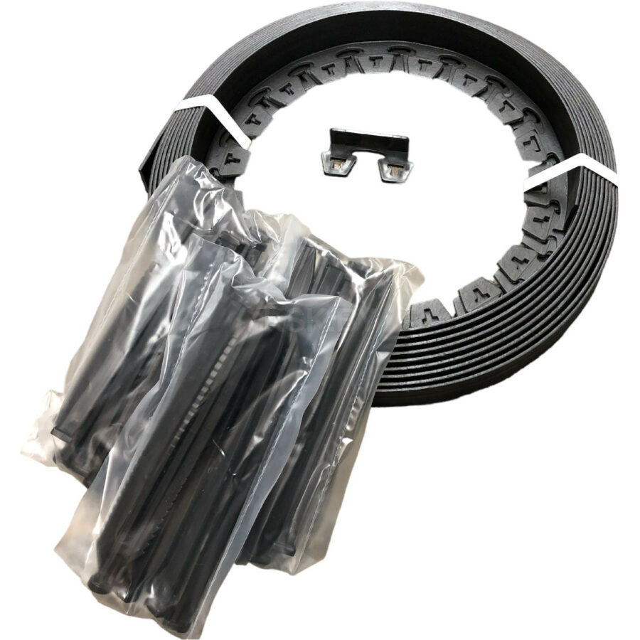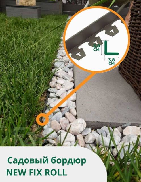 Бордюр NewFix Roll Б-100.04.04-ПП в комплекте с соединителем и крепежными анкерами 08250404-Ч используется для зонирования поверхностей, формирования клумб.