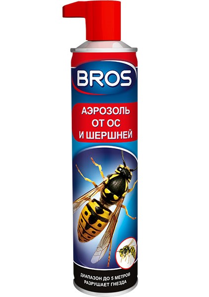 Препарат BROS предназначен для уничтожения гнезд ос и шершней. Специальное сопло позволяет распылять препарат с расстояния до 5 м, ограничивая риск прямого контакта с насекомыми. Действие препарата мгновенное и сохраняется в течение нескольких дней.