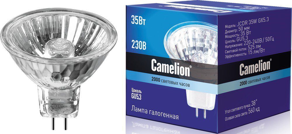 Лампа галогенная с защитным стеклом GU5.3 CAMELION JCDR 35 Вт предназначена для бытового использования в стандартных электросетях.