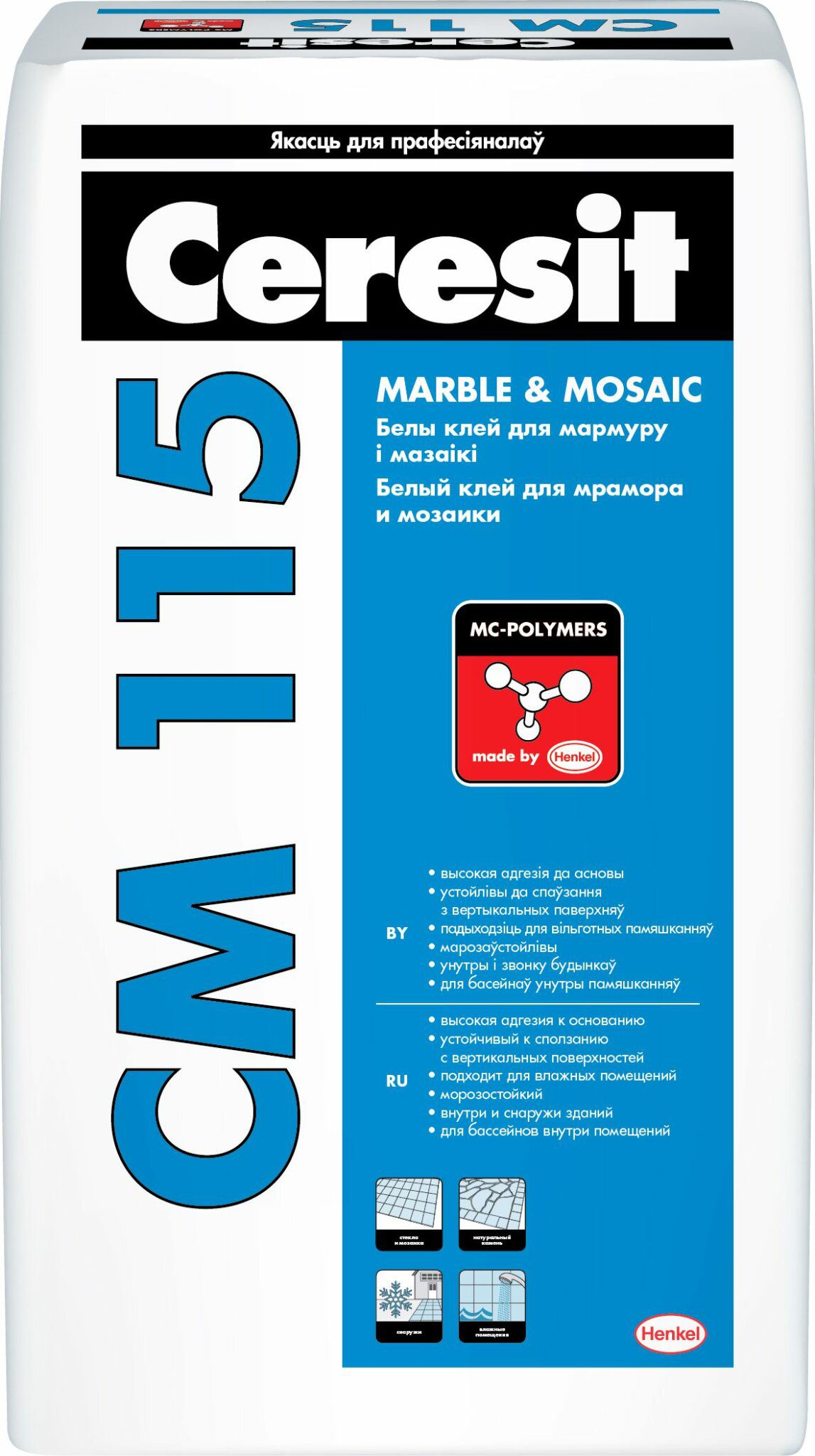 Клей для плитки CERESIT CM 115 Marble and mosaic 25 кг предназначен для облицовки бетонных, кирпичных, цементно-песчаных или цементно-известковых поверхностей и других оснований плитами из мрамора и других светлых пород природного камня, а также мозаичными плитками, в т.ч. стеклянными.Смесь Ceresit CM 115 применяется по прочным недеформируемым основаниям на стенах и полах в жилищно-гражданском и промышленном строительстве внутри и снаружи зданий. Может применяться для облицовки бассейнов внутри помещений.При облицовке деформируемых оснований в смесь необходимо добавлять эмульсию Ceresit CC 83.Свойства: высокая адгезия к основанию; устойчивый к сползанию с вертикальных поверхностей; водо- и морозостойкий; устойчивый к атмосферным воздействиям; внутри и снаружи зданий; для бассейнов внутри помещений.